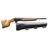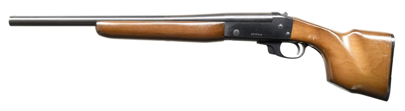 Cal. 20 Ga 2 3/4". S# D257910. Bbl. 18 1/2" choked cyl. Mfg. 1979-1981. Compact camping shotgun not meant to be fired from shoulder. Bead front sight. Hammer tip is broken but hammer is still functional. Overall length 27". Blued bbl. Anodized receiver. Hardwood pistol grip stock & forend. Grooved black buttplate w/ two storage compartments in stock. UNATTACHED ACCESSORIES: black leather scabbard. CONDITION: stock set has added varnish w/ scattered dings, scratches & handling wear. Metal retains 95% original finish w/ some edge & handling wear. Very good bright bore. (23-2551/MJC). MODERN. $300-500/