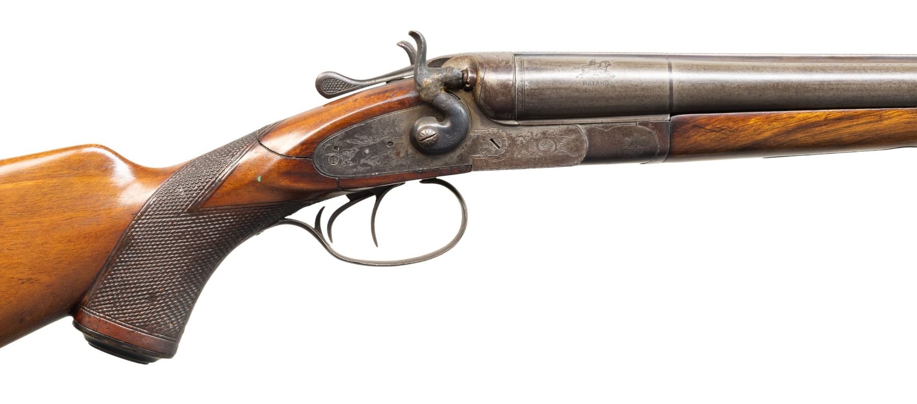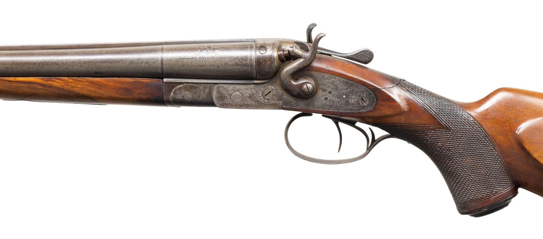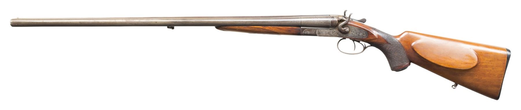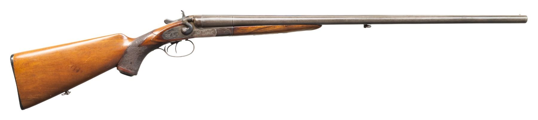 3) BELGIAN PIEPER HAMMER SXS. Cal. 16 Ga. S# 13615. Mfg. by Anciens Etablissements Pieper of Herstal, Belgium & sold by Emil Kerner & Sohn in Germany. Acier Bayard 27.5" barrels w/ matted game rib & steel bead. Fixed IC & Full chokes. Hammer locks have quail engraving. Checkered walnut stock set w/ Bavarian cheekpiece, swivel & Bishop replacement buttplate. CONDITION: metal has gray/brown patina appearance with marks, sm. dents, white paint & spots of oxidation. Sanded & refinished forearm has no visible checkering. stock has pinned repair to break at wrist along with wear & sm. marks. Bores show oxidation & fouling. (25-5488/MD). CURIO. $500-900.