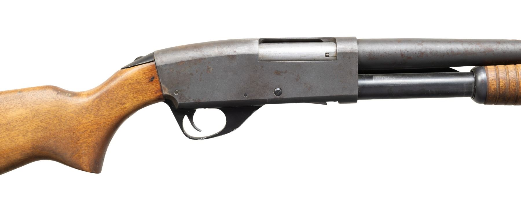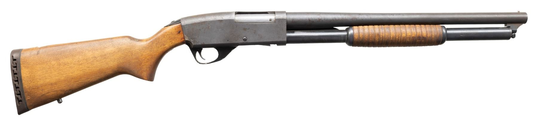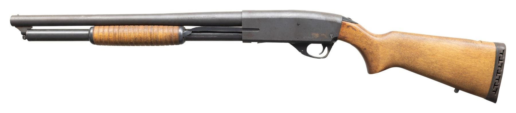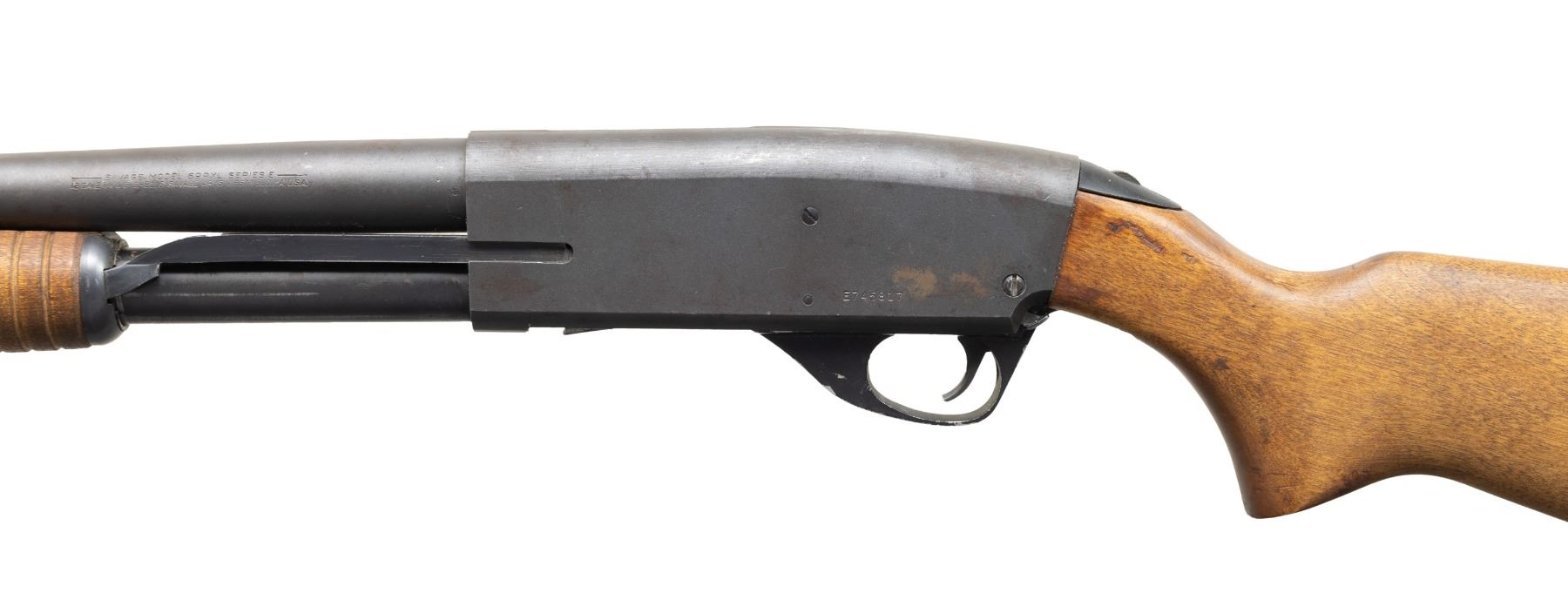 1) SAVAGE 69RXL SERIES E RIOT PUMP. Cal. 12 Ga., 2 3/4" & 3". S# E745817. Bbl. 18" w/ steel bead & Cyl. bore. Bead blasted barrel & receiver w/ blued mag. tube. Hardwood stock set w/ black pad. CONDITION: good metal appearance with handling marks & cleaned oxidation on right side. Good wood finish with large crack at top of wrist. Shiny bore. (25-5327/MD). MODERN.