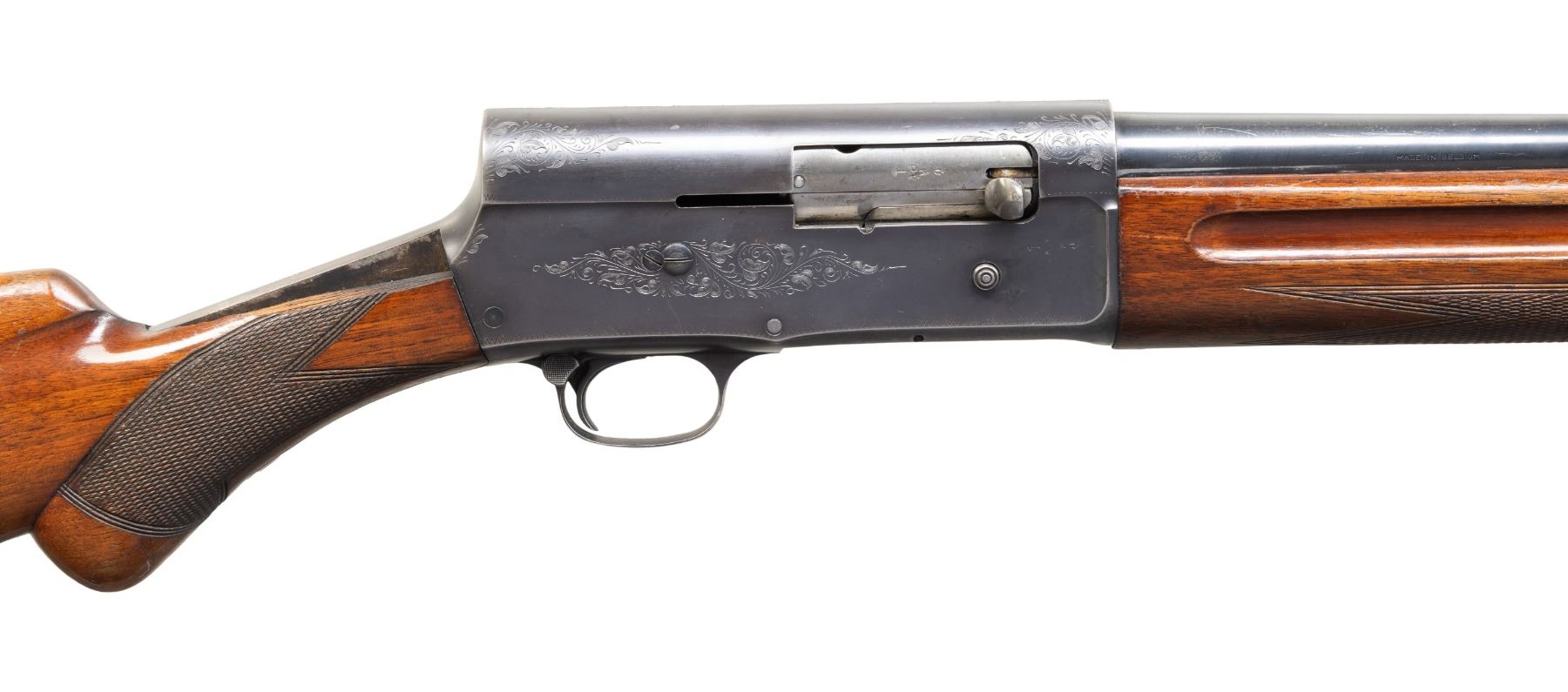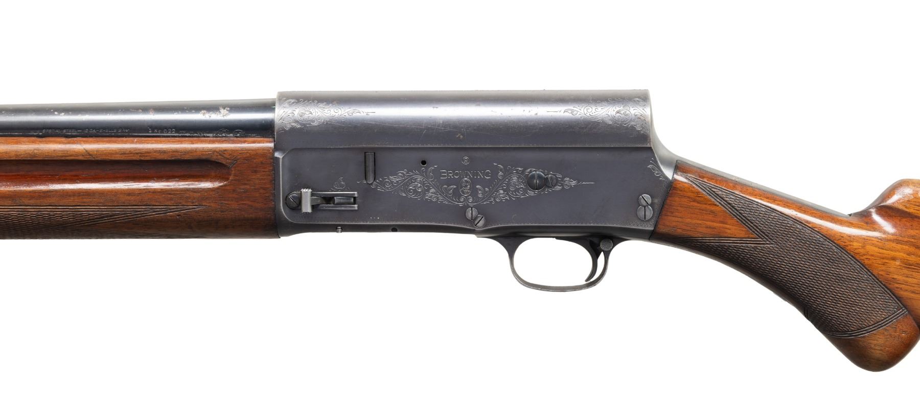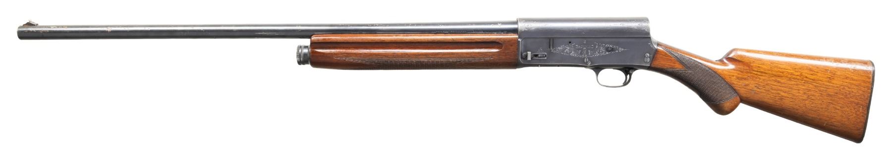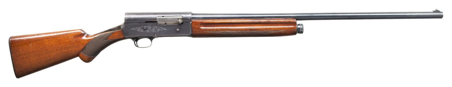 2) BELGIAN BROWNING A5. Cal. 12 Ga., 2 3/4". S# 347897 (1952). Bbl. 27.5" w/ steel bead & Mod. choke. Blued finish. Checkered walnut stock set. CONDITION: good blue with marks, spots of finish loss & oxidation. Buttstock missing large piece from wrist right side; balance of wood shows finish loss & numerous marks. Shiny bore. (25-5334/MD). CURIO.