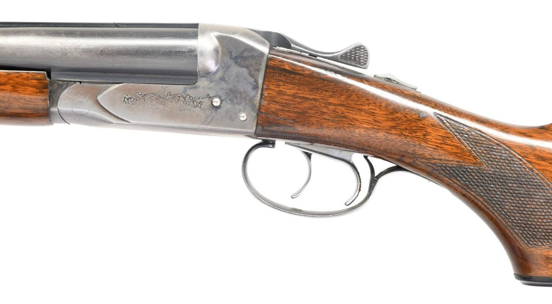 Cal. 20 Ga. 2 3/4". NSN. Bbls. 28", solid, rib choked IM & IC. Bead sights. Blued bbls. Case colored action. Double triggers. Automatic safety. Left bbl. has Fox & Savage markings. Bottom of action has game scene. Checkered pistol grip, stock, & forend. CONDITION: stock set has added varnish w/ a 1" crack behind action on left side, scattered flaking, & handling wear. Action is mostly gray w/ scattered traces of case colors & some light oxidation. Bbls. Retain 60% original blue w/ scattered fading to gray. Very good bores. (23-2502/MJC). CURIO. $500-800.