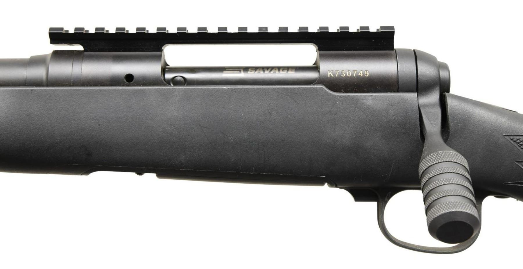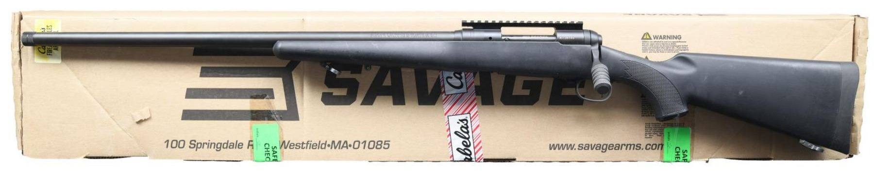 Cal. 6.5 Creedmoor. S# K730749. Bbl 26". Model 10 left handed bolt action rifle mfg. by Savage. The left side of the bbl. exhibits the model and cal. designations above Savage's mfg. information. S# on left side of receiver. Matte black finish with 1 piece checkered black polymer buttstock. Large cylindrical bolt handle with knurled rings. Threaded muzzle with muzzle nut cap. MAGS: 1 4 rd. UNATTACHED ACCESSORIES: matching factory box. CONDITION: metal components retain bountiful amounts of their original factory finish, exhibiting few minute superficial marks from handling. Mirror bore, exhibiting well defined rifling throughout. Stock exhibits mild superficial marks from handling and storage. Box shows some exterior wear, but otherwise remains sturdy and serviceable. (23-5027/MLW). MODERN. $300-500.