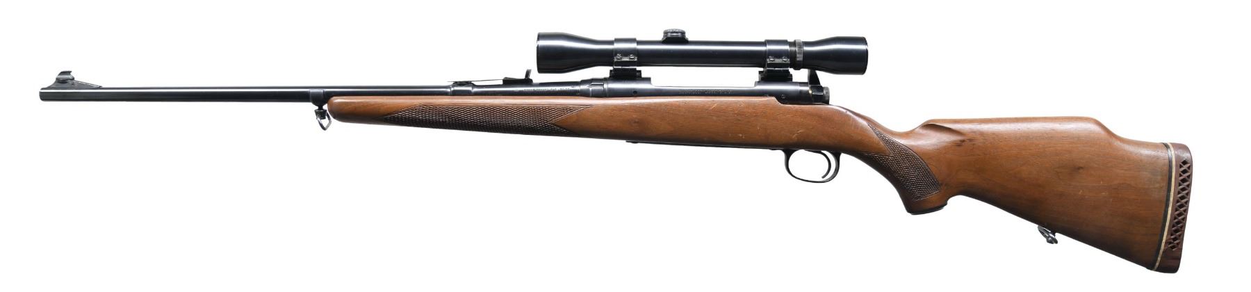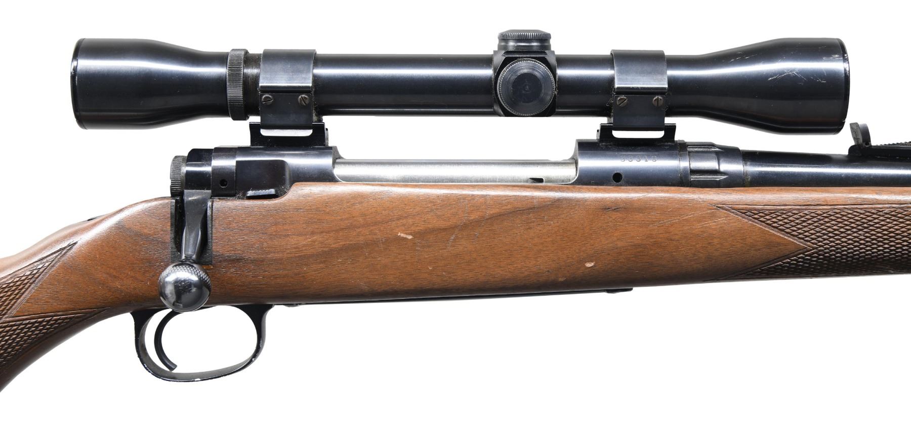 Cal. 30-06. S# 33318. Bbl. 22". Ramped bead front sight. Sporting-style rear sight. Unmarked, receiver-mounted scope. Scope has a fine crosshair reticle and green-tinted optics. Blued finish with black anodized trigger guard. Checkered pistol grip stock with bottom-mounted sling swivels and Pachmayr White Line recoil pad. LOP: 13 5/8". CONDITION: The stock shows scattered light dings and handling marks. Metal retains 95% of its blue, with some flaking on the trigger guard and scattered handling & edge wear. Action functions properly when hand-cycled. Bright, near-excellent bore. (24-7149/MJC). MODERN. $300-400.