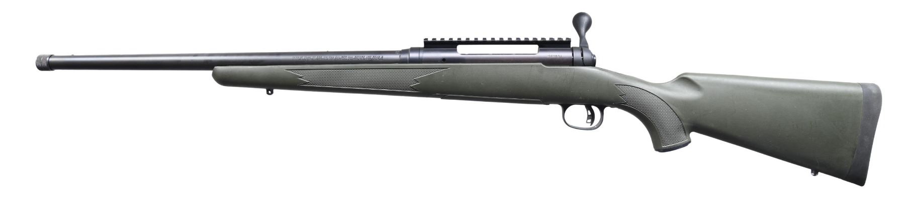Cal. 338 Win. S# J292504. Bbl. 20" threaded. Rifle lacks sights but is equipped with an EGW 220 slug gun picatinny scope rail. Extended bolt handle & Accu-Trigger. Matte blue finish. Checkered green synthetic stock with bottom mounted sling studs & unmarked recoil pad. LOP: 13 3/4". CONDITION: stock shows scattered scuffs & handling marks. Metal retains 92% original matte blue with scattered edge & handling wear. Action functions properly when hand cycled. Very good + bright bore. (25-591/MJC). MODERN. $600-800.