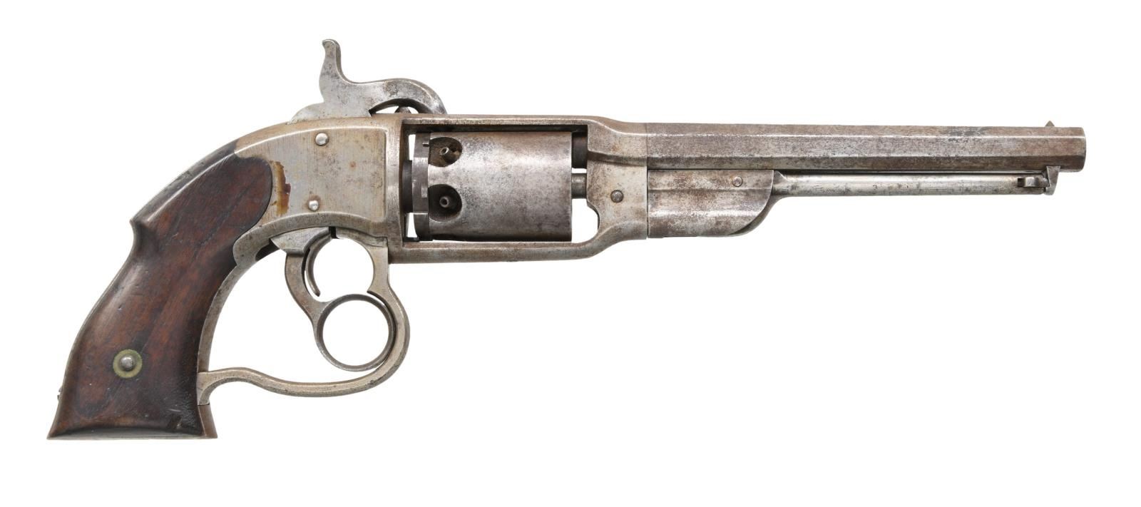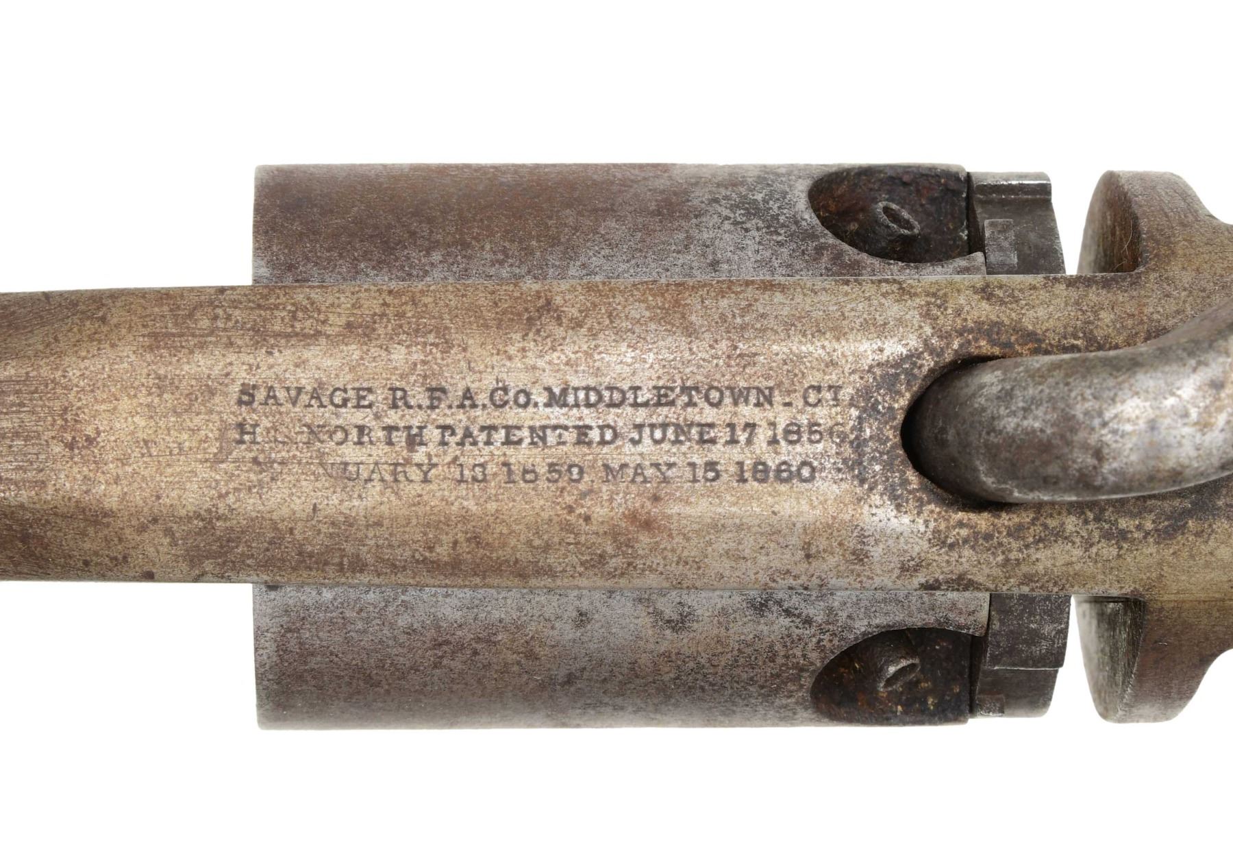 Cal. 36. S# 3727 (beneath right grip panel). Bbl. 7 1/8". Model 1861 Navy percussion revolver, mfg. by Savage Revolver Firearms Company. Top strap is marked with Savage's mfg. and patent information. Metal components exhibit a gray patina. Frame is mounted with 2-piece smooth wood grips, which are matched to the frame in pencil on the interior of the panels. Cone front fight with V-notch rear sight. CONDITION: metal components exhibit a gray patina, with areas of oxidation, pitting, and age-related discoloration present overall. Bright bore, exhibiting scattered spots and areas of dark pitting while retaining strong rifling throughout. Action functions and cyl. indexes appropriately when cycled by hand. Wood grips exhibit scattered marks and impressions from handling and storage, with some chipping present along the edges of the butt. (01-25454/MLW). ANTIQUE. $1,000-1,500.