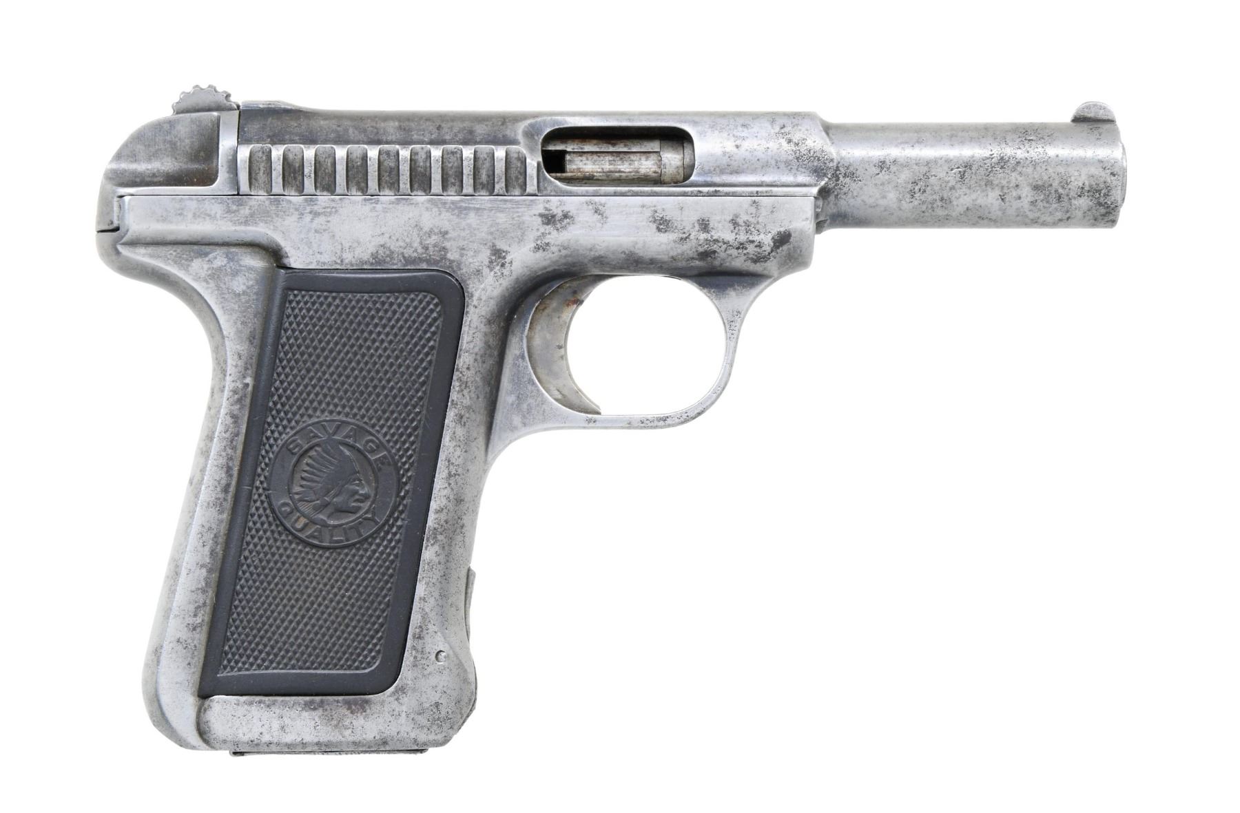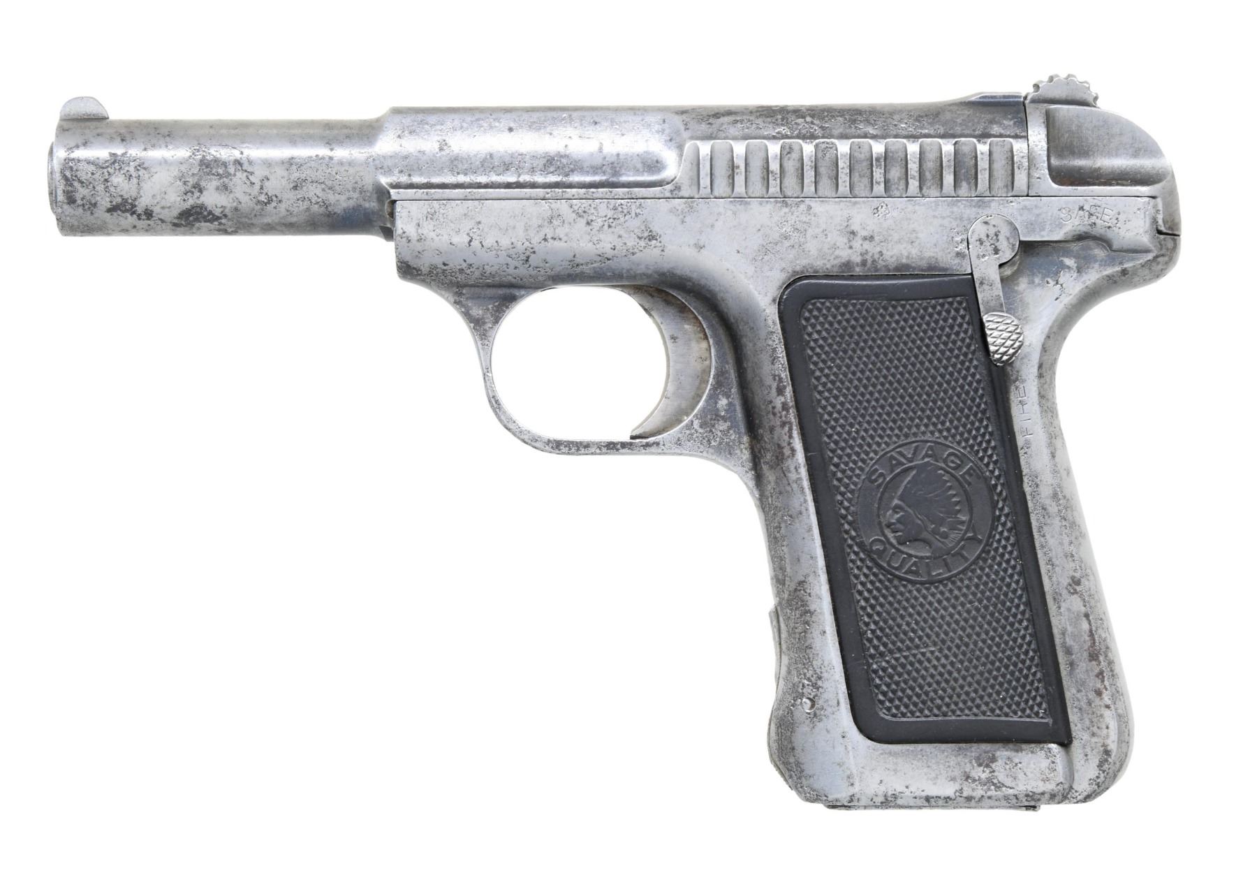 Cal. 7.65mm. S# 175791. Bbl. 4 3/4". Model 1907 semi-automatic pistol mfg. by Savage. Top of the slide is marked with Savage's mfg. and patent information, followed by the dual cal. designation "CAL.32./ 7.65.M-M.". Frame is mounted with 2-piece Savage checkered black hard rubber grips. Fixed half-moon blade front sight, with fixed U-notch rear sight. Loaded chamber indicator tab has broken off and is absent. MAGS: 1 10-rd. CONDITION: metal components have been heavily cleaned, retaining traces of original bluing, with the balance exhibiting a gray patina and areas of moderate pitting overall. Bore exhibits consistent mild pitting, with several areas of dark oxidation/pitting present towards the center, while retaining good rifling throughout. Grips show some smoothing, as well as some superficial marks from handling and storage, but otherwise remain sturdy and serviceable. (25-2540/MLW). CURIO. $150-250.