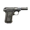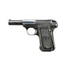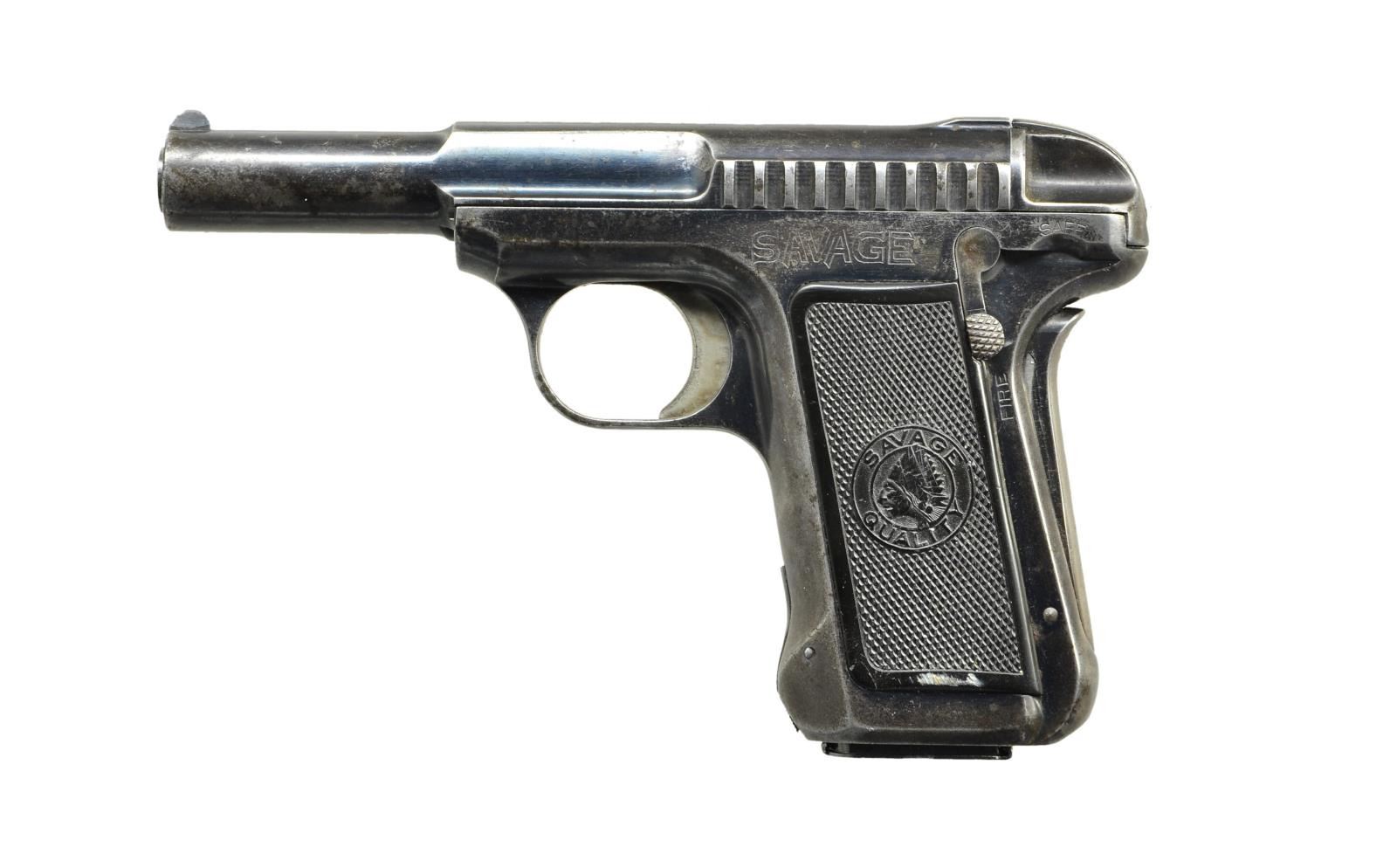 Cal. 32 ACP. S# 134470. Bbl. 4". Mfg.1915. Blued finish. Fixed sights. Serrated slide. Left side safety. Front mounted mag release. Shrouded hammer.. Black plastic checkered grips w/ Savage logo in center. MAGS: 1 steel 10 rd. CONDITION: Finish coverage complete & consistent w/ significant thinning & gentle patina under close inspection. Grips in descent condition w/ only a few tiny impressions & a scuff mark on left side. Bore still has some shine & a little frost w/ descent rifling. (22-6090/JZ). CURIO. $300-500.