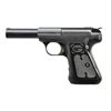 Cal. 380 ACP. S# 26168B. Bbl. 4 1/4". Mfg. 1920-1928. Distinctive trapezoidal hard rubber grips (screw retained rather than snap ins of previous models), swept back hammer spur plus front strap mag. release operates from bottom portion rather than upper. Soft matte toned original appearing metal finish plus in the white bbl. Case colored trigger & mag. release. Also offered in 32 ACP; 380 scarce & more desirable. Flat wire recoil spring rather than rnd. of lesser powered 32's. MAGS: 1 very good to excellent 2 tone 9 rd. marked "380CAL"; proper drop free functioning. CONDITION: careful scrutiny yields some very faint signs of thinning at muzzle end of slide. Overall near excellent including bore & grips w/ unfired appearance. PROVENANCE: Estate Collection of Kenneth Horn (Grandson of JC Higgins). (22-430/NW). CURIO. $650-900.