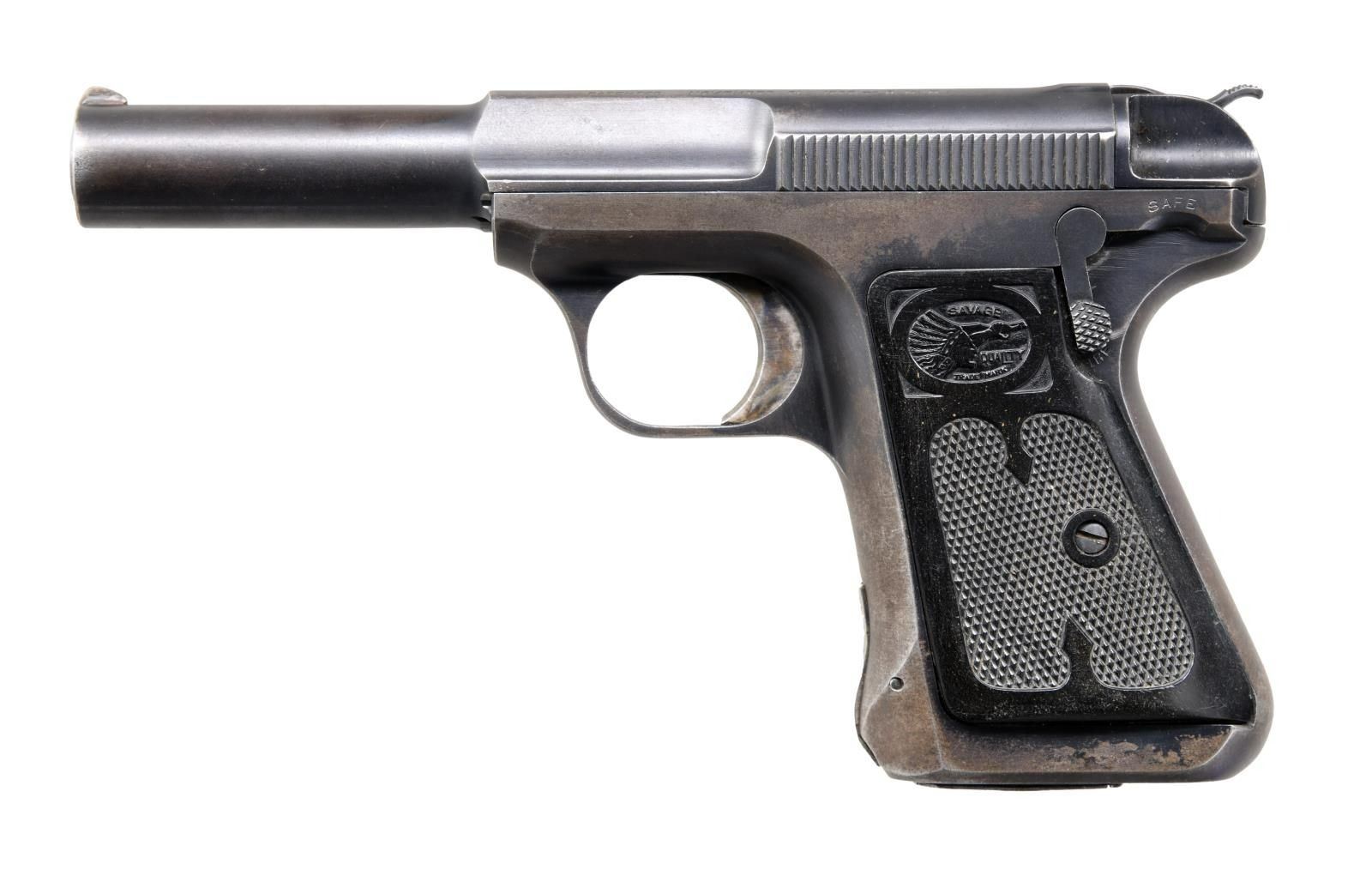 Cal. 380 ACP. S# 234038. Bbl. 4 1/4". Model 1917 semi-automatic pistol mfg. by Savage Arms Co. Top of slide is marked with Savage's mfg. and patent information, as well as the cal. designation. Major metal components exhibit a blued finish, with the trigger being case color hardened. Frame is mounted with 2 piece Savage checkered hard rubber grips. Custom blade front sight with frame square notch rear sight. MAGS: 1 9-rd. CONDITION: metal components retain good amounts of their original factory blue finish, exhibiting wear and thinning overall that show through to a pleasing brown patina. Bright bore, exhibiting light pitting and strong rifling throughout. Grips show some smoothing and scattered marks from handling and storage, but otherwise remains sturdy and serviceable. (23-5300/MLW). CURIO. $300-500.