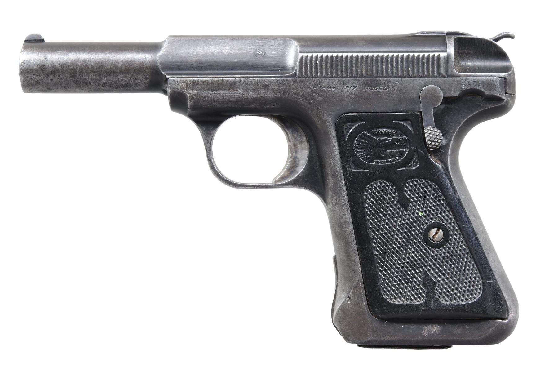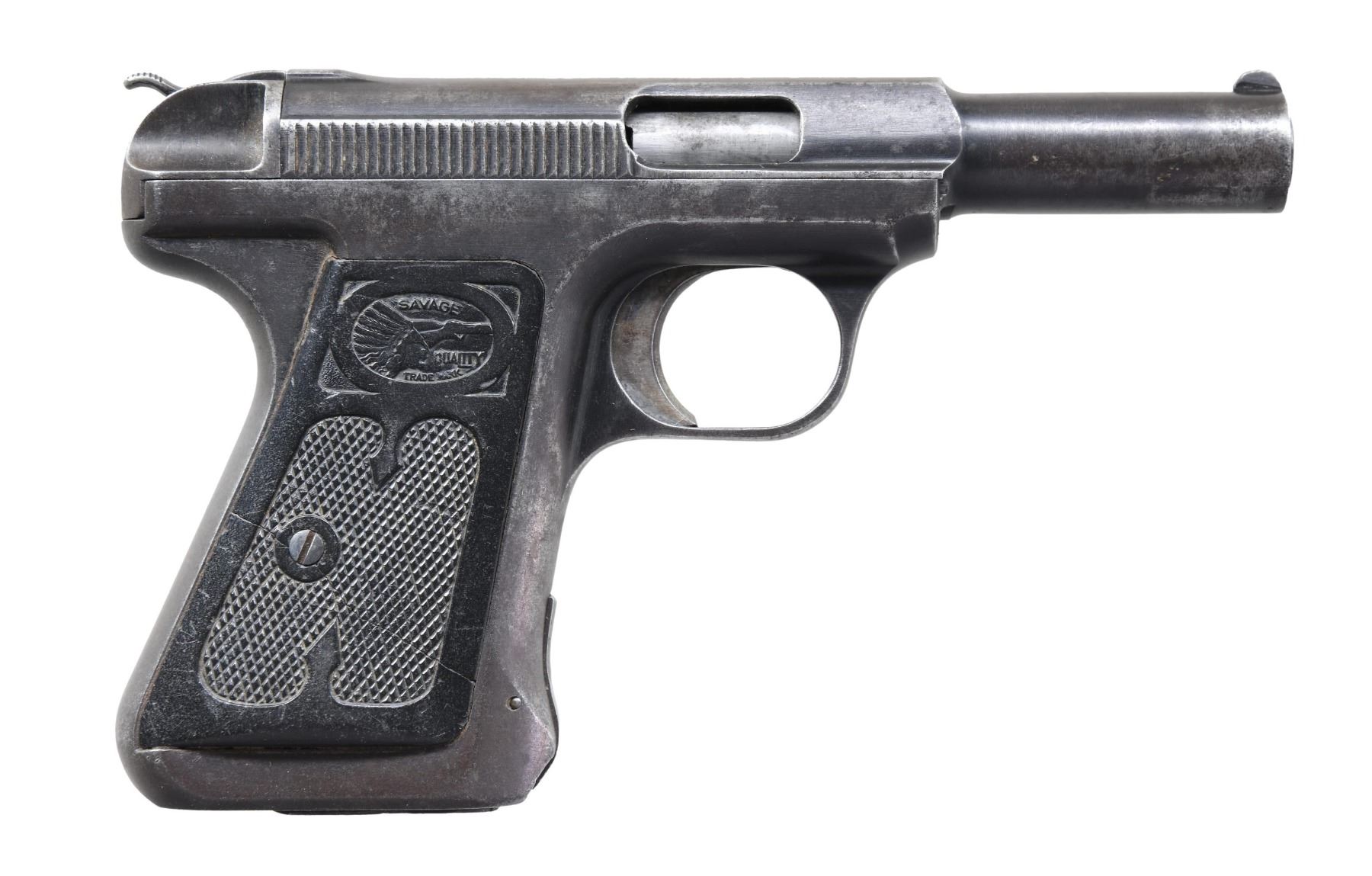 Cal. 7.65mm. S# 250795. Bbl. 3 3/4". Model 1917 semi-automatic pistol mfg. by Savage. Top of the slide is marked with Savage's mfg. and patent information, followed by the dual cal. designation "CAL. 32./ 7.65. M-M.". Left side of the frame is marked "SAVAGE 1917 MODEL". Metal components exhibit a blue finish overall, save for on the trigger, which exhibits a case color hardened finish, as well as the bbl., which is polished in-the-white. Frame is mounted with 2-piece Savage checkered black hard rubber grips. Fixed half-moon blade front sight, with fixed square notch rear sight. MAGS: 1 10-rd. CONDITION: metal components retain fair amounts of their original factory blue finish, with the balance exhibiting wear and thinning that shows through to gray patina, as well as scattered spots of light to mild surface oxidation and pitting overall. Trigger retains fair to good amounts of its original case color hardened finish. Bore exhibits consistent mild to moderate pitting, while retaining strong rifling throughout. Grips show scattered superficial marks from handling and storage, with the right grip exhibiting exhibiting a large break that runs the horizontal length of the panel. (25-2535/MLW). CURIO. $250-400.