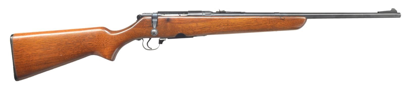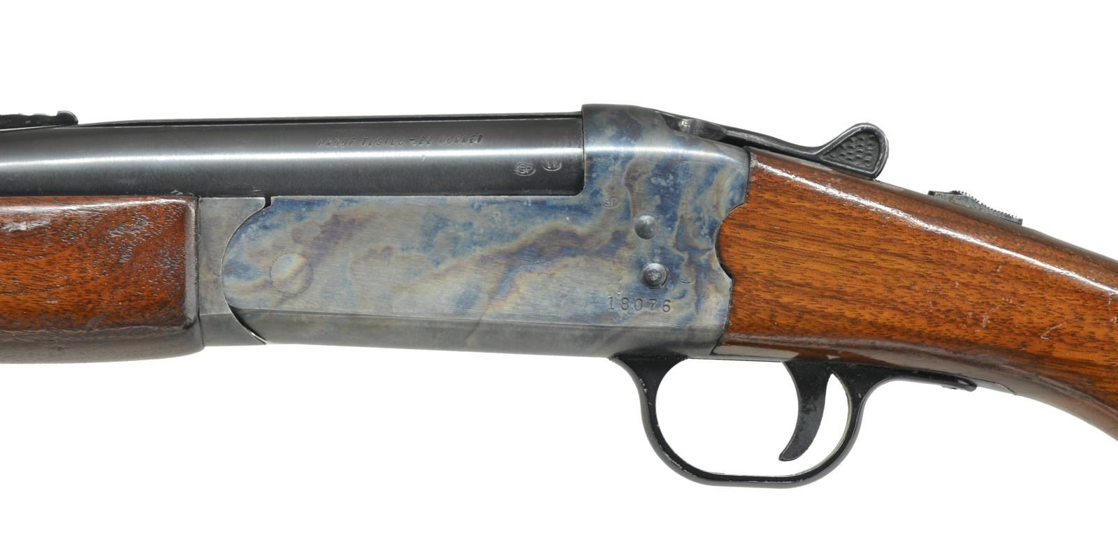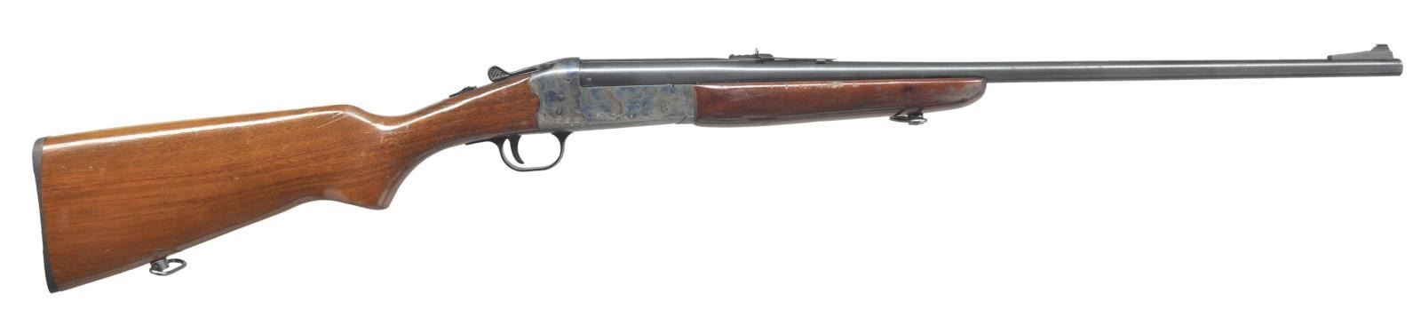 1) MODEL 219 SINGLE. Cal. 22 Hornet. S# 18076. Bbl. 26" tapered rnd. Ramp mounted bead front sight w/ elevator adj. sporting rear sight & grooves for tip off scope mt. Case colored top lever break open hammerless action w/ top tang safety. Left side has stamped identification mark "F.F.H." Walnut forearm & Pistol grip stock w/ original buttplate having added sling swivels. Forearm has additional bored through hole near tip for unknown application. Mfg. 1938-1965. CONDITION: 90% lightly faded bbl. blue. Action has 80% lightly faded case colors w/ an area of light pitting on right side. Wood has lightly worn finish showing finish chips, dents, scratches & spots of mildew. Bore has lightly worn rifling w/ spots of pitting forward of chamber. (21-3045/DS). CURIO.