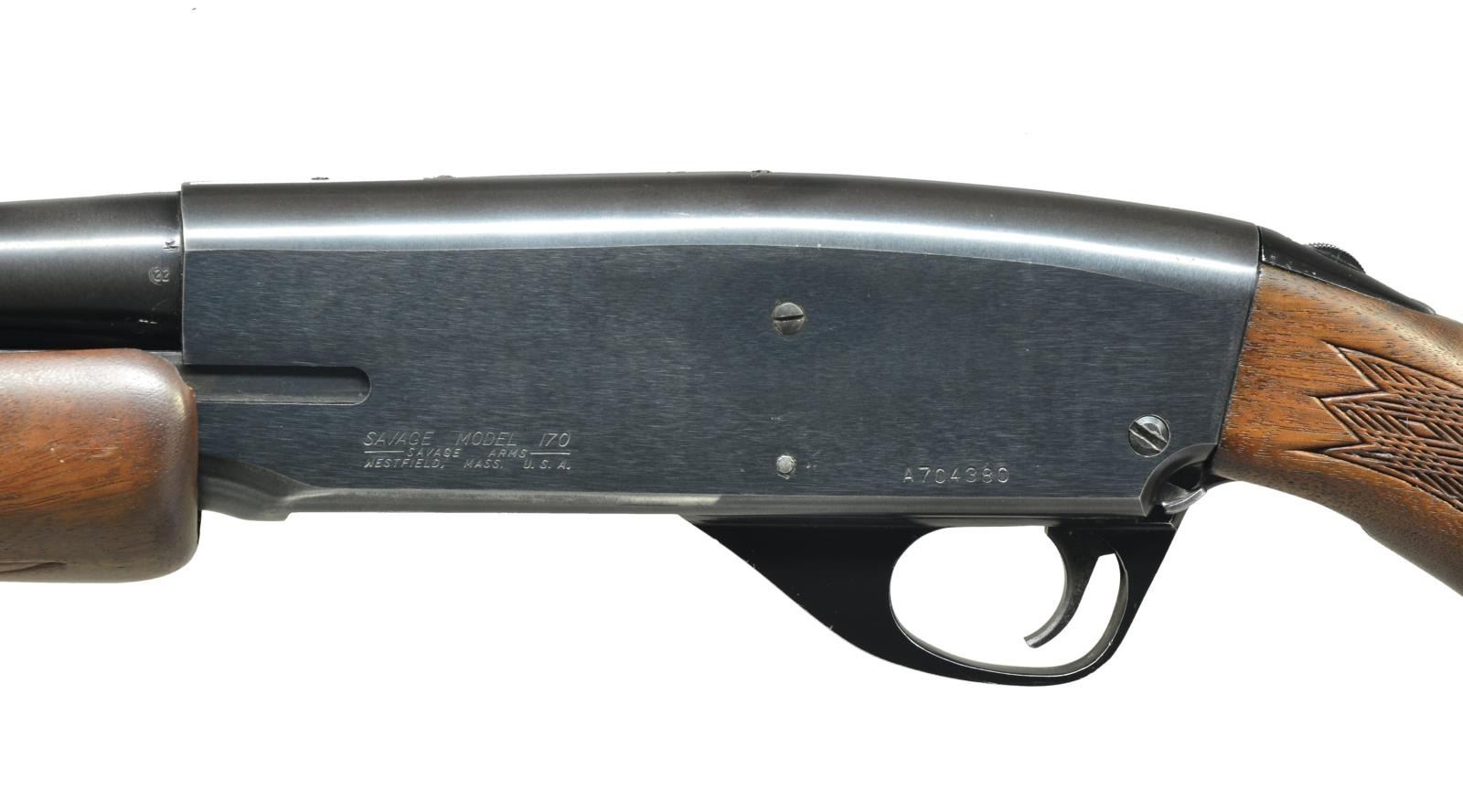 2) MODEL 170 PUMP. Cal. 30-30 Win. S# A704380. Bbl. 22" rnd. Ramp mounted bead front sight w/ replacement U notch sporting rear sight. Receiver is factory drilled for scope attachment. Top tang sliding safety. Half length tubular mag. Walnut forearm & Monte Carlo stock w/ pressed checkering & original buttplate. Toeline of stock & mag. band have swivel bases. Mfg. 1970-1981. CONDITION: 85% lightly worn blue. Wood has worn finish showing some scratches & marks. Bright bore retains strong rifling. (21-3046/DS). MODERN.