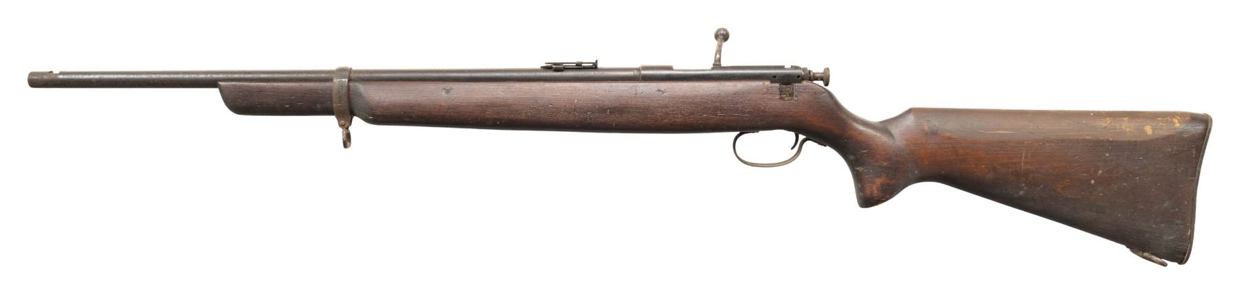 Cal. 22 S, L, LR. NSN. Bbl. cut down to 22" w/ front dovetail & replacement Winchester carbine rear sight. Receiver has added holes for receiver sight & dovetail cuts into bolt channel. Replacement target style walnut stock w/ curved buttplate. CONDITION: fair to poor overall with oxidation & sanded comb of stock. Very good rifling. PROVENANCE: Estate of Groves Herrick. (25-5638/MD). MODERN. $100-200.