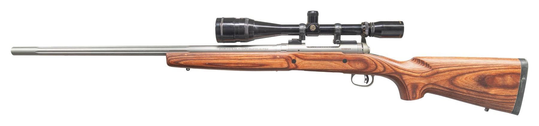 Cal. 308 Win. S# K055142. Bbl. 26" heavy fluted. Rifle is sighted with a Burris Signature 6-24x scope. Scope has crosshair reticle, very good optics & bikini covers. Accu-Trigger. Stainless finish. Laminated stock with bottom mounted sling studs. MAGS: 1-4 rd. CONDITION: stock has Savage sticker present on underside of forend & some light handling wear. Metal shows a couple small spots of light oxidation staining including on bolt handle. Action functions properly when hand cycled. Bright near excellent bore. (25-5611/MJC). MODERN. $400-600.
