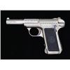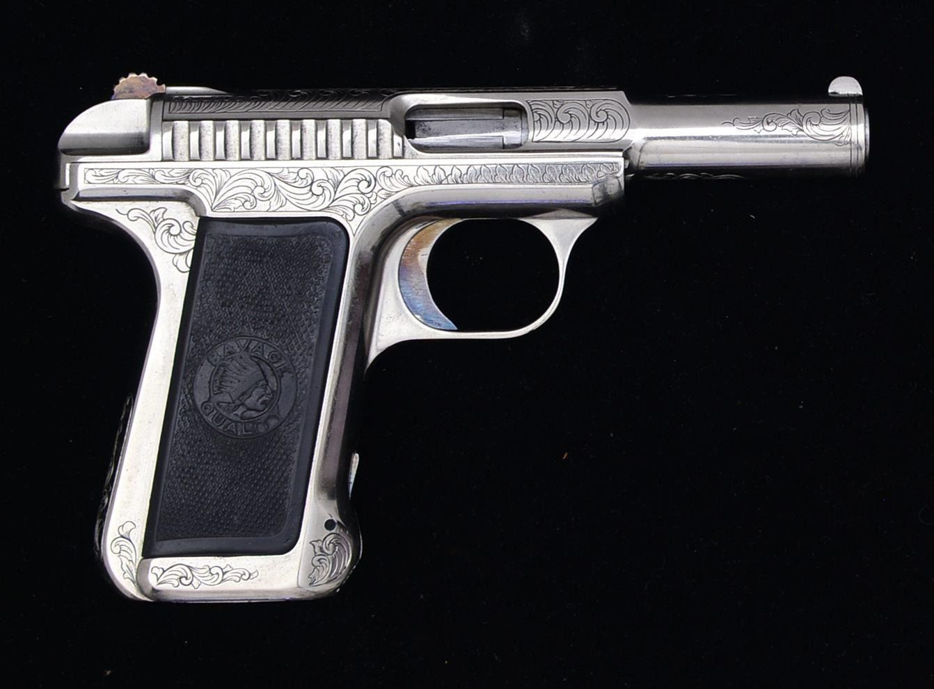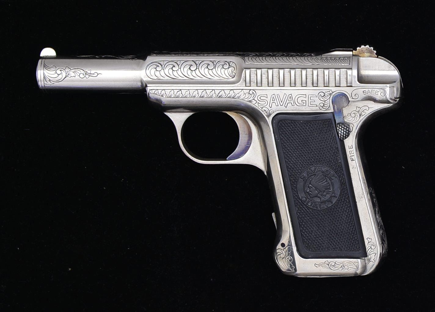 PISTOL. Cal. 7.65mm (32 ACP). S# 118991. Bbl. 3 13/16" w/ loaded chamber indicator & in the white finish. Mfg. 1915 (1910-1917) soon following period where Savage outsold Colt in 32 ACP pocket pistols. Appears factory workmanship as polished & non polished areas directly follow those of blued pistols. Simple elegant leaf & scroll engraving w/ front strap plus bottom of frame by trigger guard blank; no engraving on breech plug assembly (only polished in normal positions). Nitre blued trigger, safety, mag. release & its pivot pin. Checkered hard rubber grips w/ Savage Indian head logo. MAGS: very good plated 10 rd. w/ floorplate having appearance of slight prior like pitting. CONDITION: very good overall appearance w/ slight fading on blued parts; especially sides of trigger. Very sharp markings throughout w/ no evidence of extra polishing. Finish has fine pinprick tone often seen on aged plating appearing almost like prior light faint pitting. Replacement (aftermarket) grips w/ light hand wear appearance. Good bore w/ even light pitting. If post factory work, still a fine representative example. (20-3839/NW). CURIO. $700-1,000.