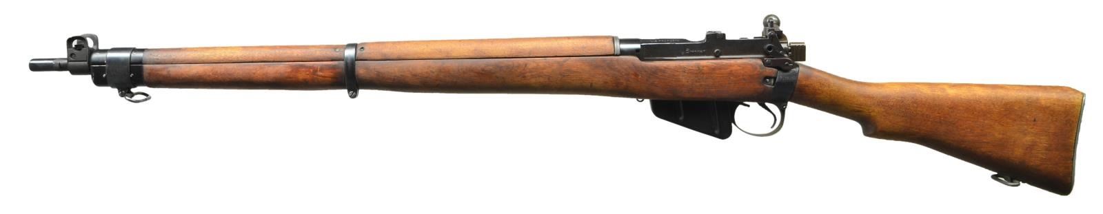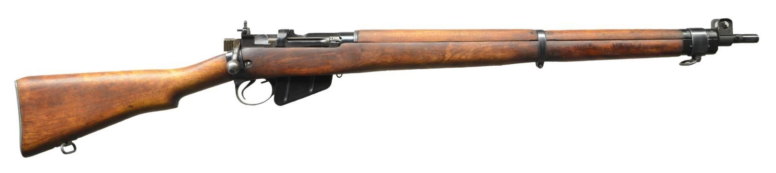 Cal. 303 Brit. S# 71C218. Bbl. 25 1/2". Left side rail marked "U.S. PROPERTY". Left side of receiver marked w/ flaming bomb, Savage "S" & "No. 4 MkI*. Bolt is numbered "71C2180", other parts appear unnumbered. Flip up aperture rear sight w/ 300 & 600yd graduations. Blade front sight w/ protective ears. Bottom mounted rear & front sling swivels. Rear band has no swivel present. Hardwood stock set w/ faint Savage marking on underside of butt. Rear handguard is a bit loose. MAGS: 1-10 rd. detachable unnumbered. CONDITION: sanded stock set shows some handling marks & dings. Balance of metal has a reblue finish w/ smaller parts having arsenal parkerized & Suncorite finishes. Metal shows some light oxidation & thinning. Good bore w/ some frosting & light pitting. (22-5879/MJC). CURIO. $500-700.