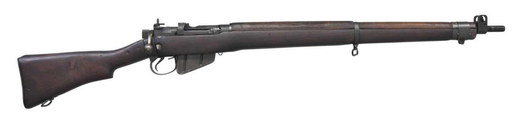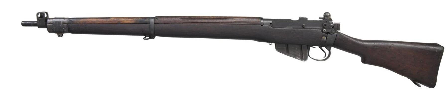 Cal. 303 Brit. S# 73C3130. Bbl. 25". Import marked at muzzle. Flip type aperture rear sight. Blade front sight w/ protective ears. Receiver is marked on left side w/ flaming bomb "S" "NO 4 MK I*". Receiver rail is marked on top "U.S. PROPERTY". Rifle was mfg. in U.S. & given U.S. Property marking in order to satisfy the conditions of the "Lend Lease Agreement" between U.S. & Great Britain. Replacement bolt, cocking piece and bolt head marked "S". Slot type bolt head release. Fabricated trigger guard. Walnut stock set except front handguard which is hardwood replacement. Steel trap buttplate. MAGS: 10 rd. detachable mag. CONDITION: stock set has moderate to heavy wear and staining with scattered handling marks throughout. Buttstock has notable chipping at toe and end of handgrip. Inletted repair at top of grip. Small inletted repair on right side of butt. Repaired crack at right rear of handguard. Metal has 60% original finish w/ wear turning gray. Very good shiny bore. (23-5330/RW). CURIO. $400-600.