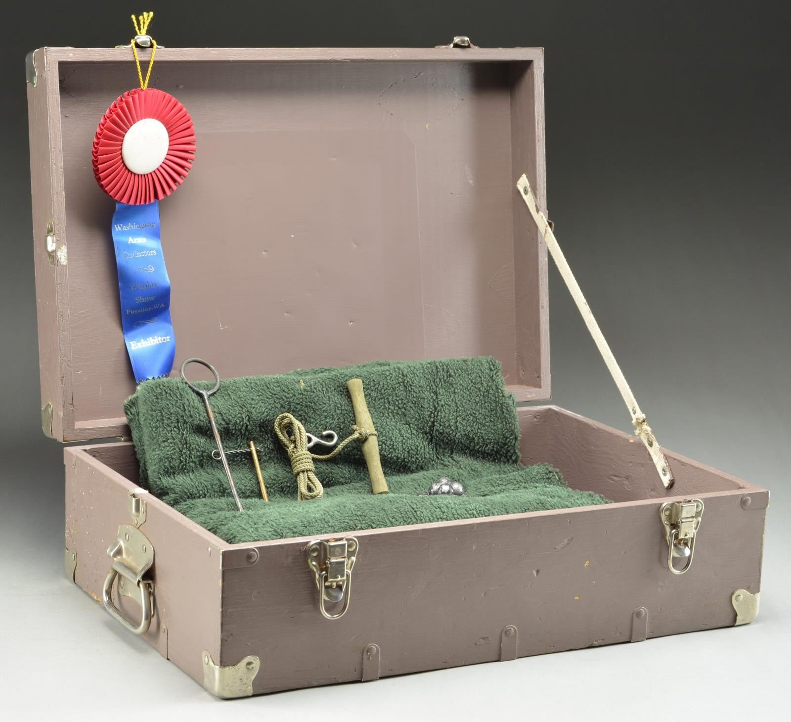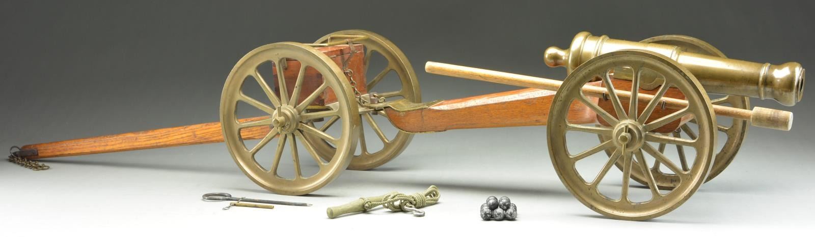 CAISSON. Cal .76. Brass cannon measuring 14.5". On hardwood carriage w/ 9" brass wheels. Overall length on carriage 25". Complete w/ caisson measuring 29" in length also w/ 9" brass wheels. Caisson has hardwood supply box measuring 5.5"x3.75"x3.25" over wheels. UNATTACHED ACCESSORIES: Caisson, hardwood ramrod, 12 lead balls, & firing accessories. Also includes painted wooden crate measuring 22"x14.75"x8". CONDITION: Canon & cart wheels have a beautiful, matching mustard brown, natural finish. Canon bore is clean w/ functioning flash hole. Carriage & caisson in very nice condition w/ matching dark natural orange finish. PROVENANCE: From the Lifelong Collection of Glen E. Mattox. This cannon was the cannon placed under Glen's casket during his funeral service. PROVENANCE: From the Lifelong Collection of Glen E. Mattox. (01-22587/JZ). ANTIQUE.$800-1,200.