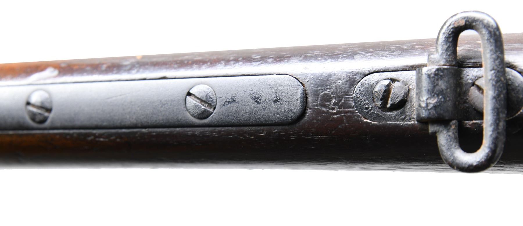 CARBINE, CONFEDERATE C&R "Q" MARKED. Cal. 54. S# 696. Standard configuration with 24" barrel, sliding breech mechanism, Brass buttplate. Bottom of butt between sling swivel and leave her plate stamped with capital "Q" which is consistent with other arms cleaned and repaired at the Richmond Armory in 1864 & 1865. First model carbines are scarce to start with firing pin attached to hammer face, this is the only Confederate captured C&R S&H Army carbine documented. CONDITION: good overall, complete other than chip missing at top of butt plate and top butt plate screw, iron has dark patina with pitting, patent and make her marks have been cleaned to bring out on either side of frame. Top plate has toned patina, mechanically fine, good rifled bore. (01-27164/JS). ANTIQUE. $1,000-1,500.