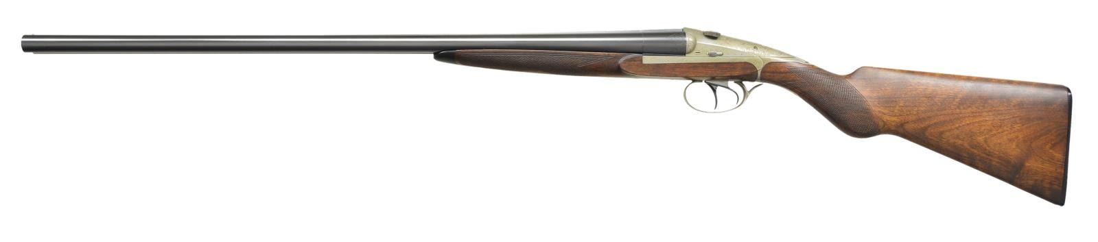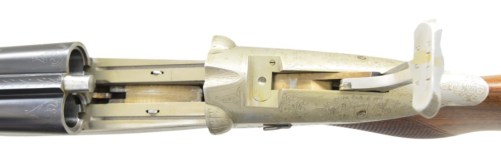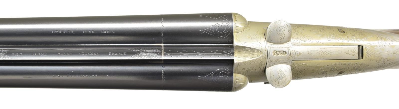 Cal. 20 Ga. S# SPC1316 (on action with barrels removed). The 25 5/8" mono-bloc barrels with raised matted rib and no under rib are marked "PHS DARNE SAINT ETIENNE FRANCE" on rib. Tops of barrels are stamped with Stoeger Arms name and address. Barrel flats and bottom of barrels are stamped with triple proofs, Darne logo and 5 grade markings (R15). Coin finished sliding breech action with obturating discs and toggling side safety is engraved with 70% coverage rose bouquets, scroll and various borders. "Darne" is deeply stamped on opening lever. Double triggers are blued, buttstock of lightly figure European walnut measures 14 1/2" over hard rubber Darne buttplate. Flat top point pattern checkering is on semi-pistol grip. Matching forepiece has inlet horn tip. MEASUREMENTS: BBLS: Bore Diameter: L .630. R .632. Restriction: L .011 (light mod). R.002. (IC). Wall thickness: L .030. R .028. STOCK: DAH: 2 3/8". DAC: 1 1/2"-. CAST: neutral. LOP: 14 1/2". WEIGHT: 5 lb. 11 oz. CONDITION: exceptionally fine, close to as new. Bores are bright and shiny. Stoeger's imported these guns until 1971. This model as made today, retails at $11,000 Euros. (22-5680/MGM). CURIO. $2,000-3,000.