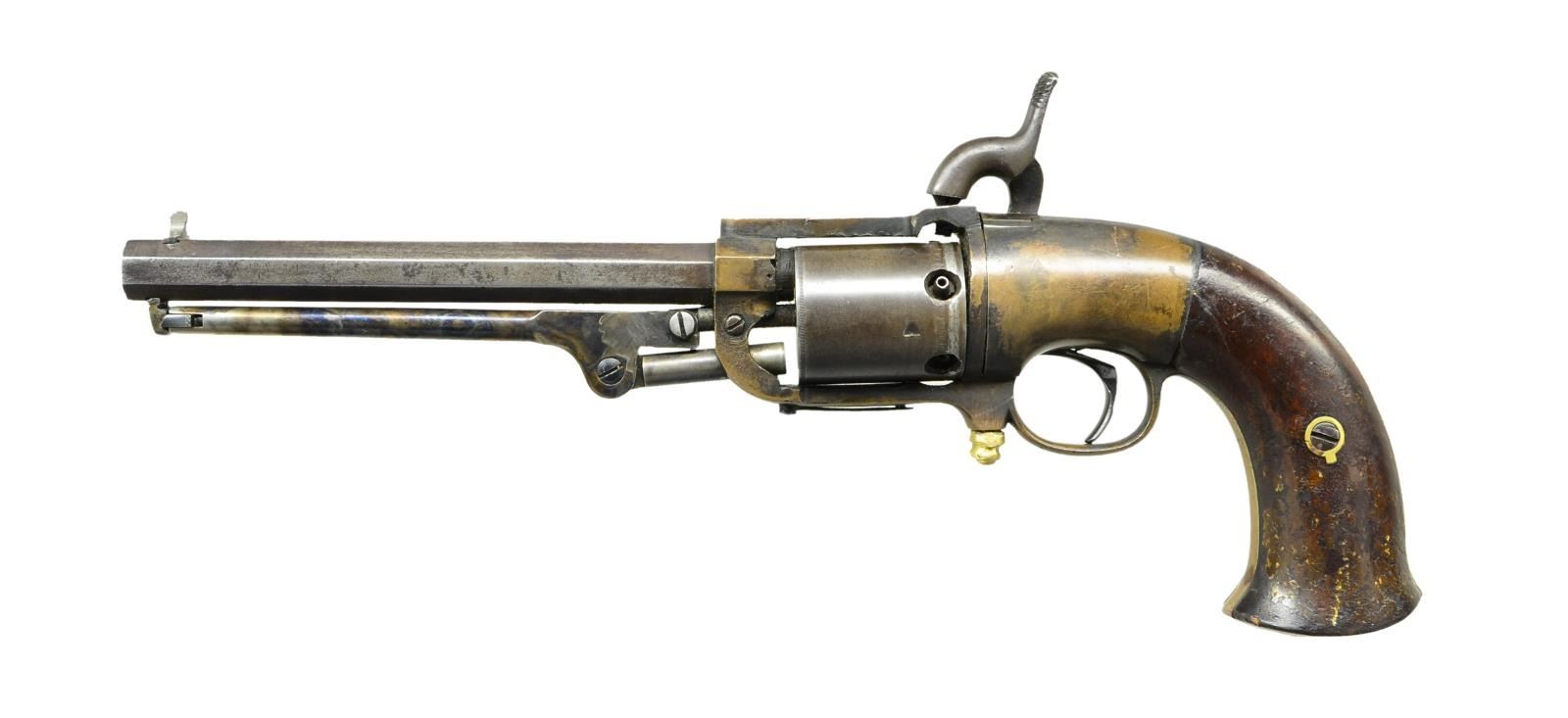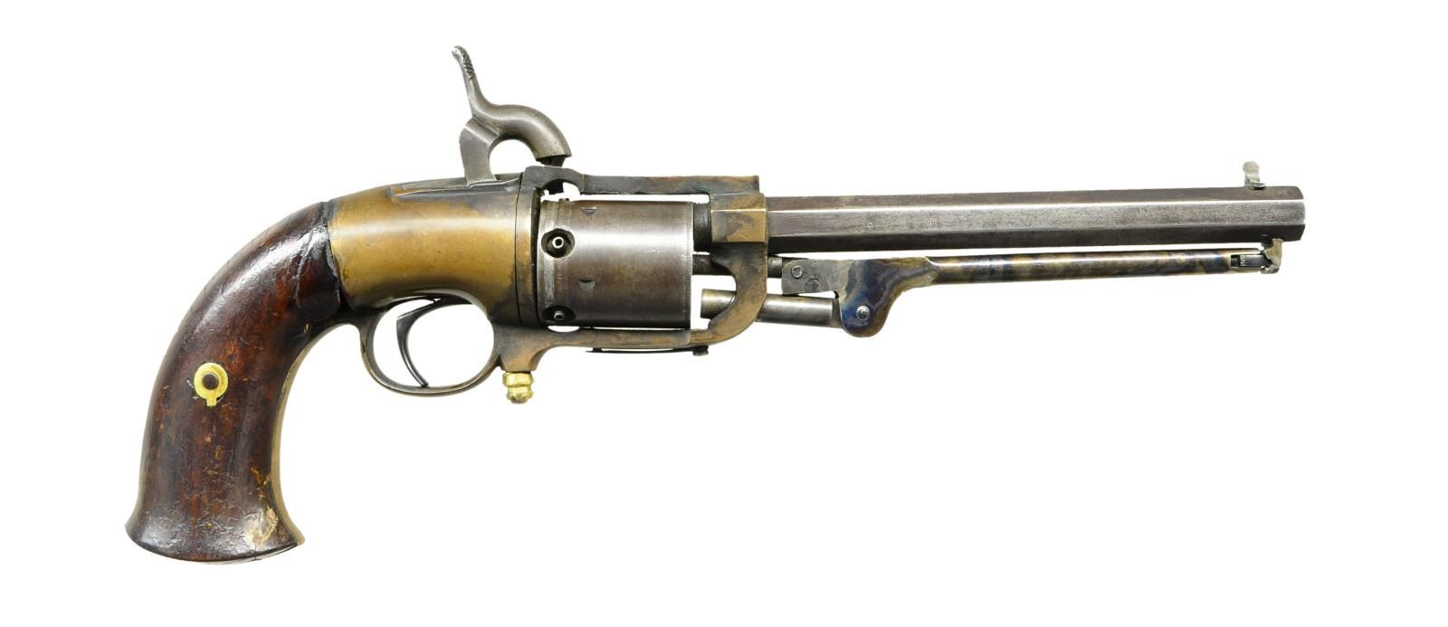 PHILADELPHIA. Cal. 41. S# 193. Bbl. 6 7/8”. This rarely seen revolver was manufactured by Jesse Butterfield of Philadelphia, Pennsylvania and is commonly called the Army model revolver. Only about 640 of these revolvers were produced from 1861 to 1862. The top of the frame is marked “BUTTERFIELD’S PATENT DEC 11. 1855 PHILADA”. This gun was originally made under a government contract for 2,280 pieces. After production of approx. 640 examples, the contract was abruptly canceled. The serial number is stamped on the barrel, butt & at the base of both grips. CONDITION: the revolver has a pleasing, though well-worn, finish. The brass has a fine mellow patina. Grips show expected wear. The loading lever, front sight & small brass nut near the trigger are replacements. The action does function, but needs adjustment. Fair bore. (01-23150/BF). $2,000-3,000.