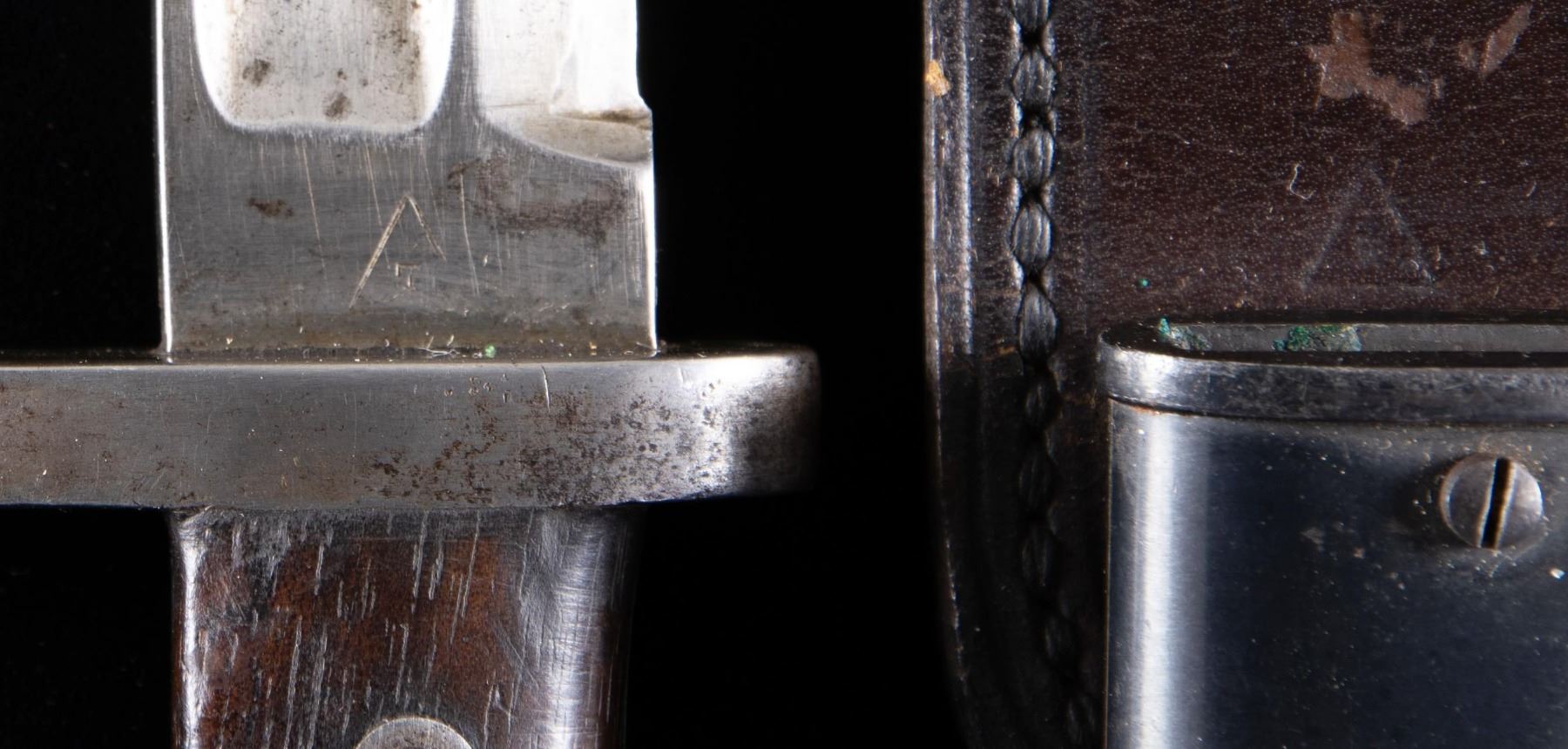 8 1/8" bright fullered. 12 5/8" overall. Bayonet is marked on right ricasso w/ "T" in triangle indicating acceptance by Ensign Nathan C. Twining. Pommel is marked w/ "9939", likely to match rifle. Straight crossguard w/ muzzle loop. Smooth walnut grips secured by two rivets. Black leather scabbard w/ blued steel tip & throat. Leather frog w/ brass belt hook. Frog is also marked w/ the triangle "T" acceptance mark. CONDITION: lightly worn blade has scattered spots of peppery oxidation. Blade has been sharpened. Balance of metal has areas of light oxidation & wear. Grips have moderate wear & handling marks. Scabbard is in very good condition w/ scattered handling marks. Stitching is tight. Tip & throat retain a large percentage of their original blue. (02-24537-16/RW). NON-GUN. $300-500.