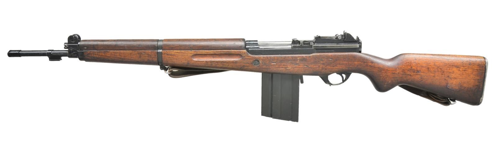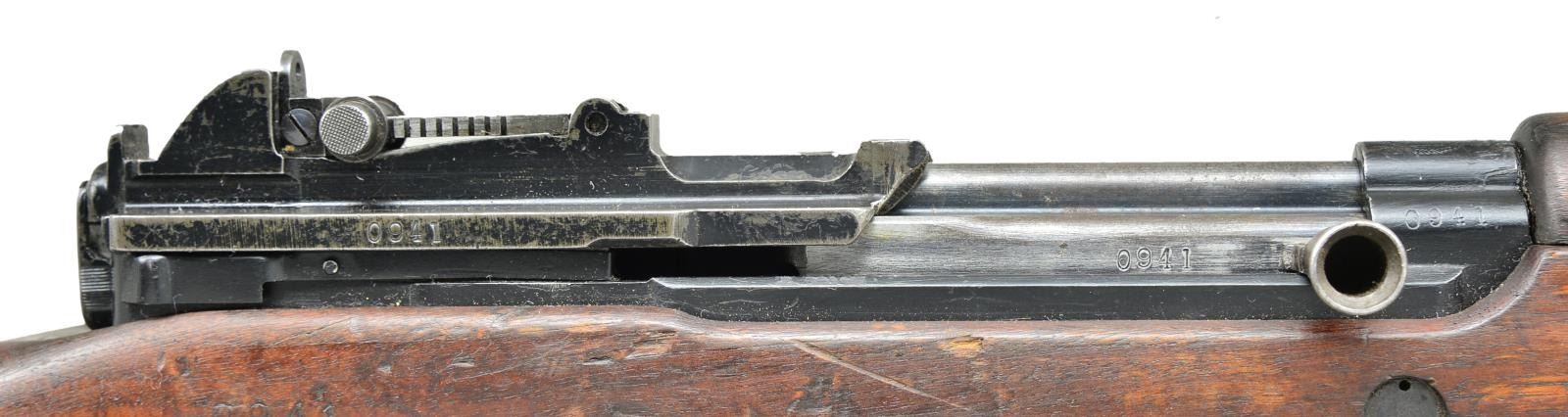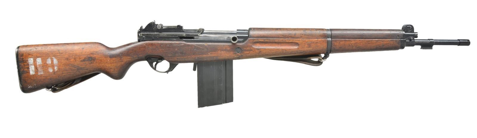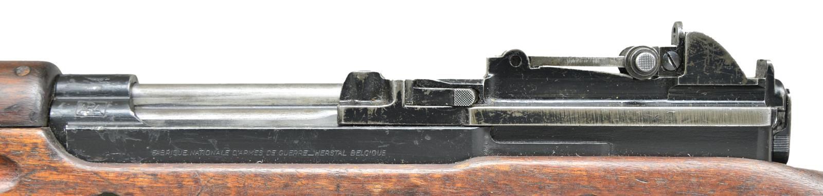 SEMI-AUTO MILITARY RIFLE. Cal. 7.62 NATO. S# 0941. Bbl. 23 1/8". Numbers match on receiver, bolt, receiver cover & stock. Import marked on bottom of bbl. These rifles were converted from their original 7.65 Argentine caliber to 7.62 NATO in the early 1960s and given detachable 20 rd. magazines. The magazines while similar to the FAL magazines in profile are not interchangeable. Receiver ring is marked on top w/ Argentine crest & marked on left side w/ boxed "ARA" which stands for Armada de la Republica Argentina which is the Argentine Navy. Tangent aperture rear sight adj. for windage. Blade front sight w/ protective ears. Bbl. has muzzle cap installed. Walnut stock set w/ trap buttplate. Buttstock is marked on the right side "119" rack number. Correct brown leather sling. MAGS: 1 unmarked 20 rd. & 1 unmarked approx. 10 rd. UNATTACHED ACCESSORIES: screw on flash hider in butt & shop made hook shaped tool. CONDITION: stock set has moderate wear, dents, staining & scratches throughout. Metal parts have thinning worn original black coating w/ scratches & handling marks. Very good shiny bore. PROVENANCE: from the estate collections of Charles P. Obremski. (22-1252/RW). CURIO. $700-900.