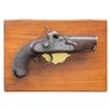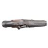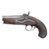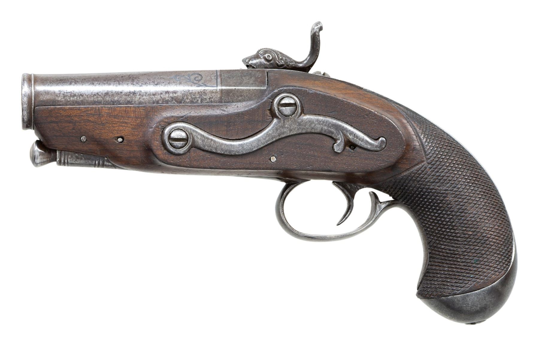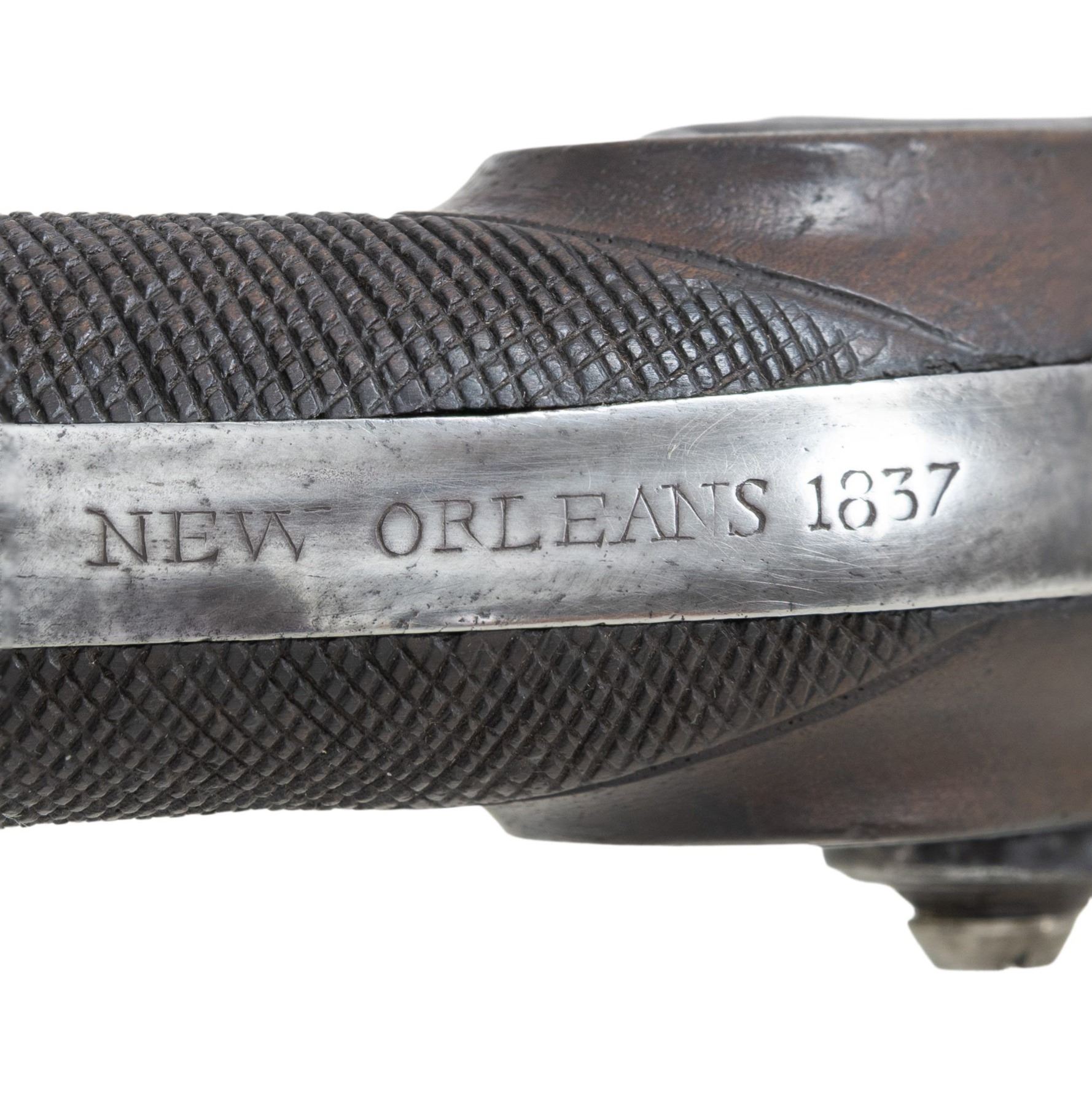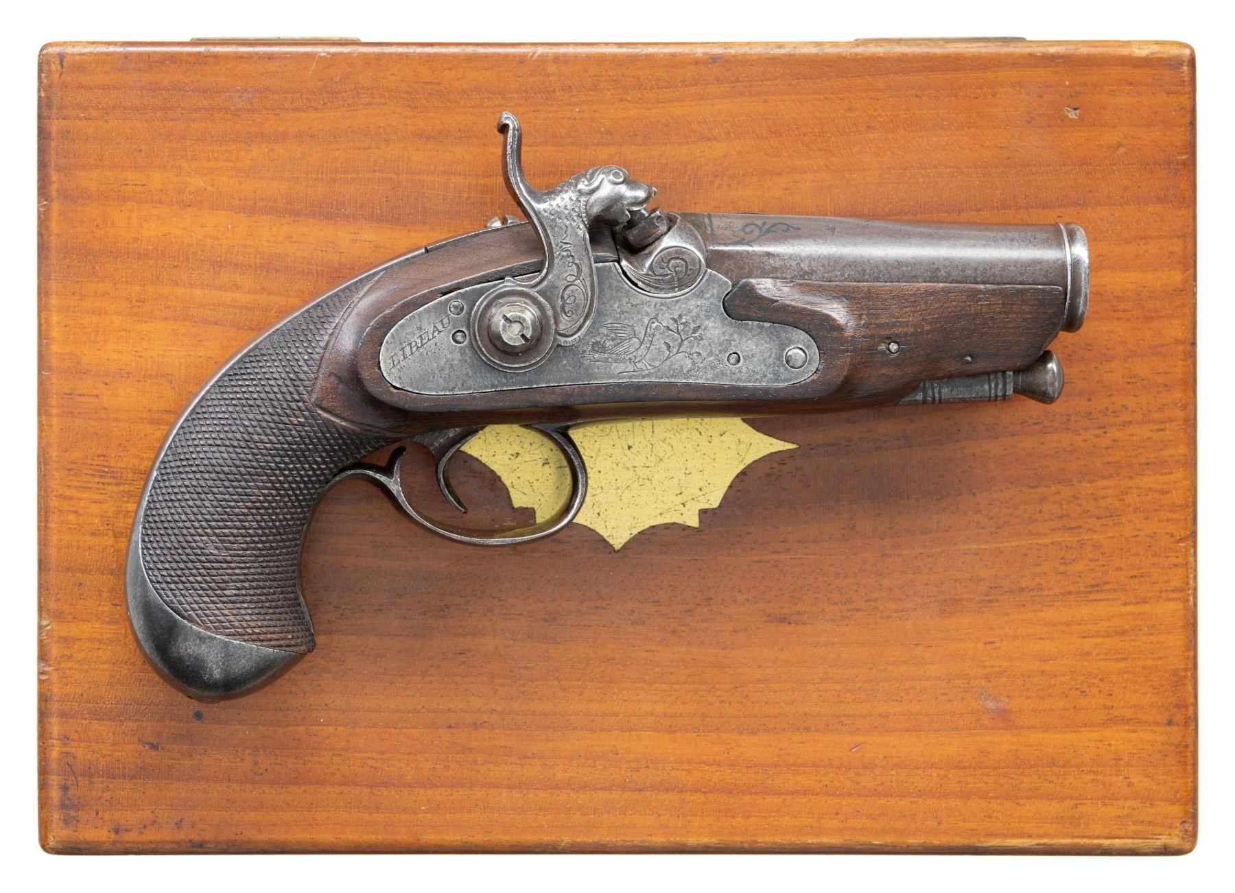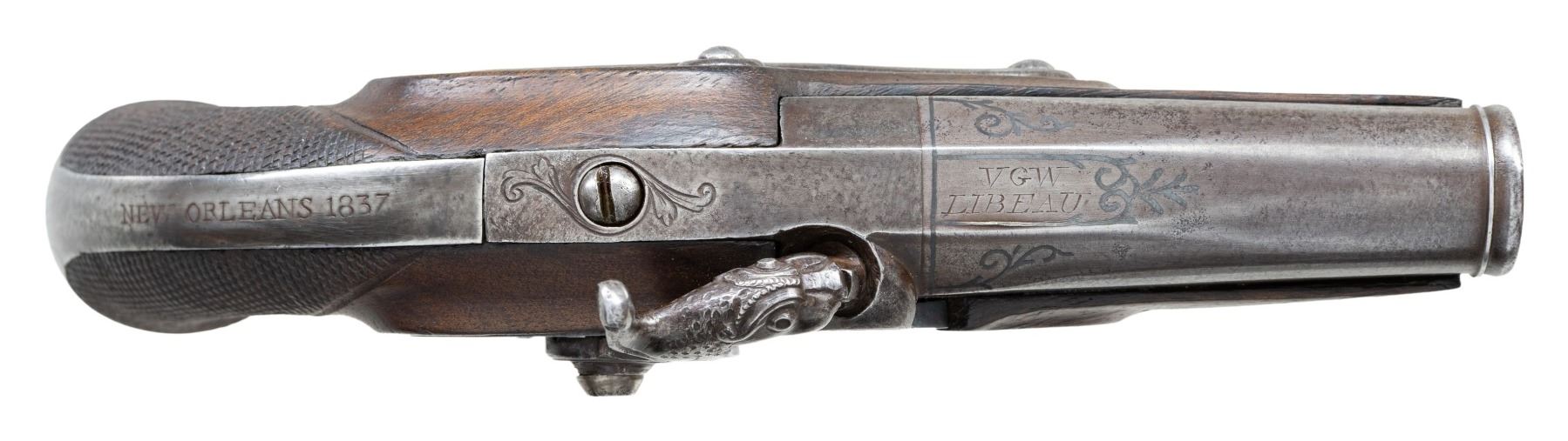 V.G.W. LIBEAU OF NEW ORLEANS. Cal. 68. S# NSN. 3" octagon to round barrel with cannon type muzzle has silver scroll inlay around maker's name "V.G.W." "LIBEAU" on top flat (known to be working in New Orleans in 1847). Front spring lock with fancy full relief carved dog's head hammer is engraved with bird feeding on a twig in front of hammer; "LIBEAU" is at rear. American walnut stock with checkered bag grip is steel mounted. Backstrap is engraved "NEW ORLEANS 1837". Trigger guard has spear finial and sideplate has scrolled extension at rear. A steel ram rod with button head is held by turned steel thimble. UNATTACHED ACCESSORIES: pistol is housed in small walnut jewelry case with brass trim; lined in purple velvet. Also included is an information card. CONDITION: good to very good. Metal retaining traces of original finish under light brown patina. Wood is very good with most of its original finish with a number of marks. Bore is good; lightly pitted. Lock will not hold at full cock. Case is fine. An important American derringer; not listed in Flayderman. (01-27877/MGM). ANTIQUE. $5,000-7,000.