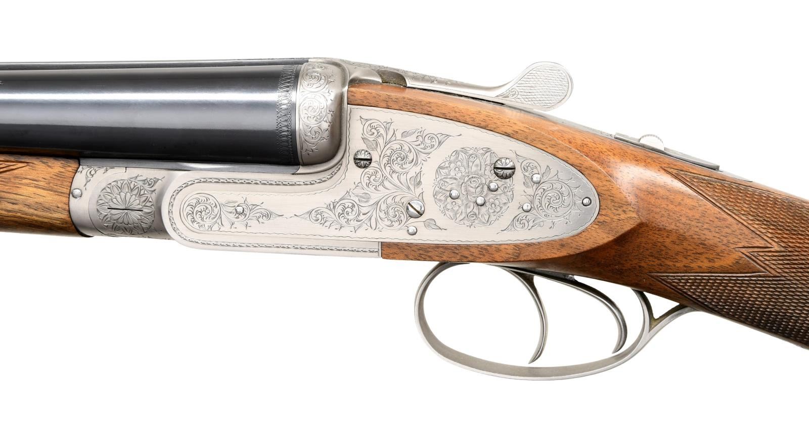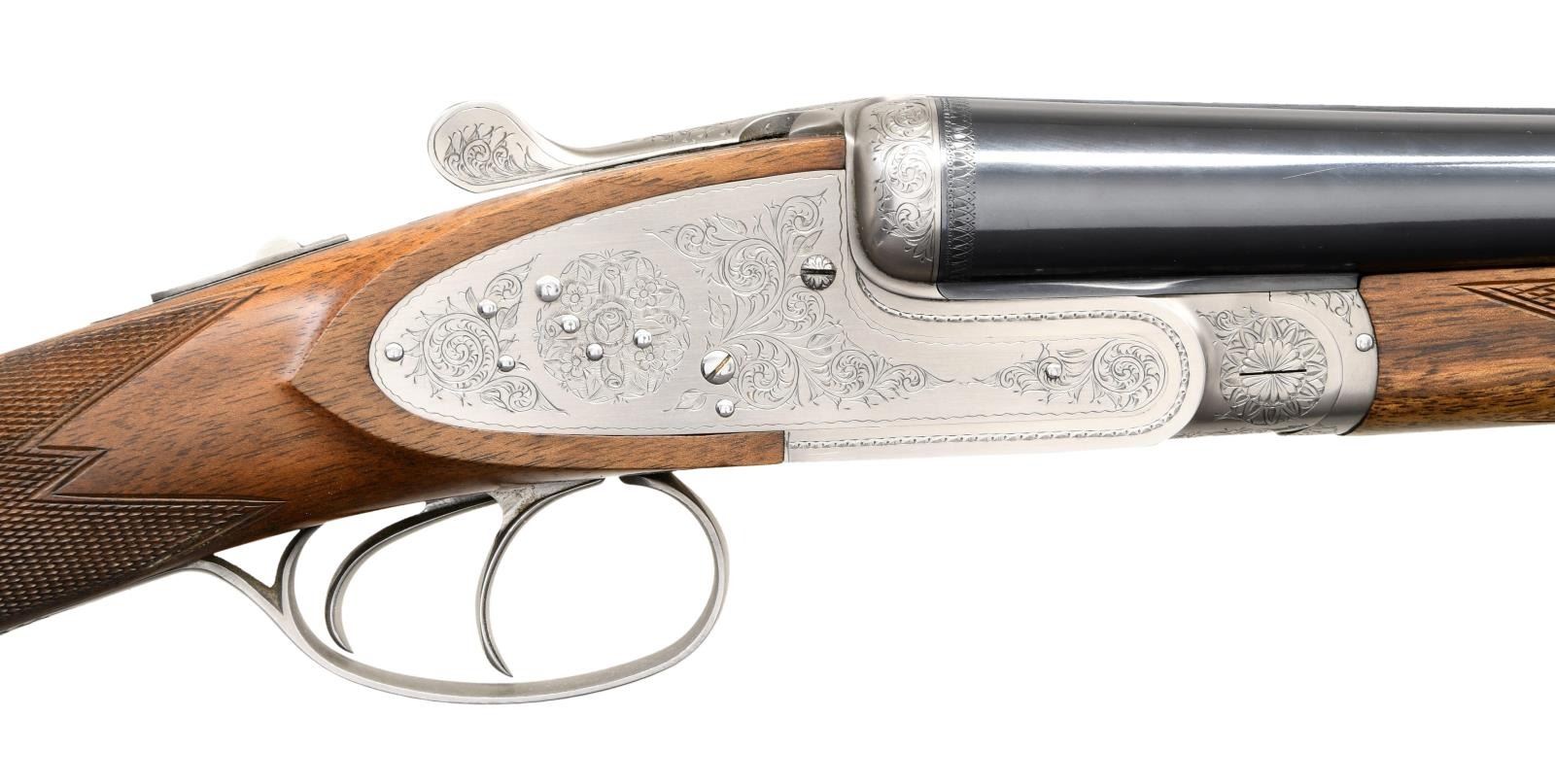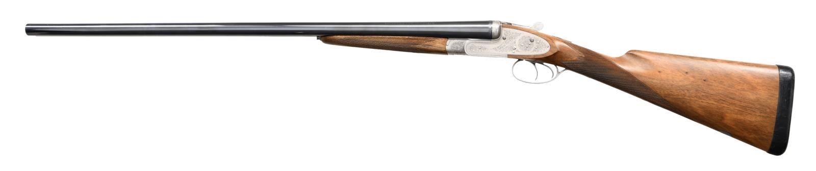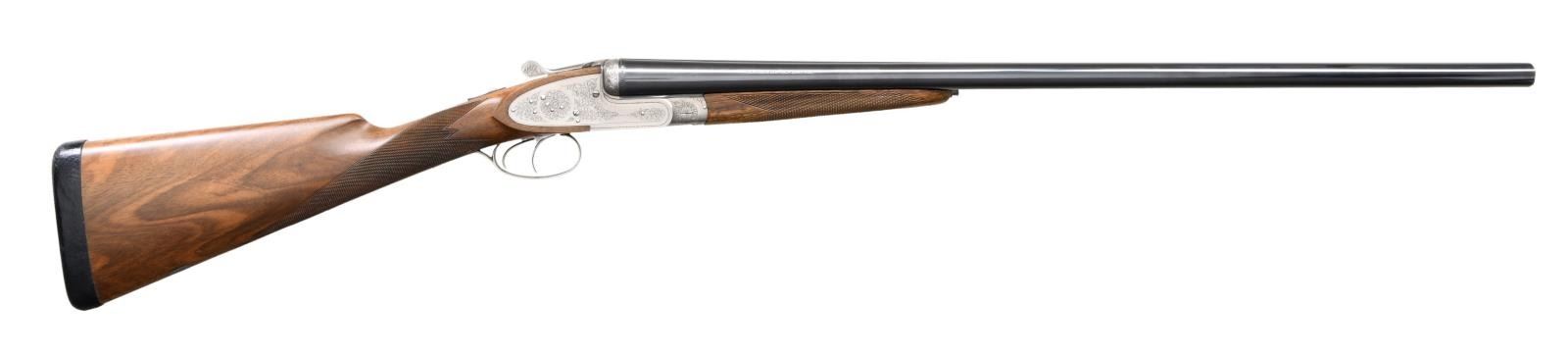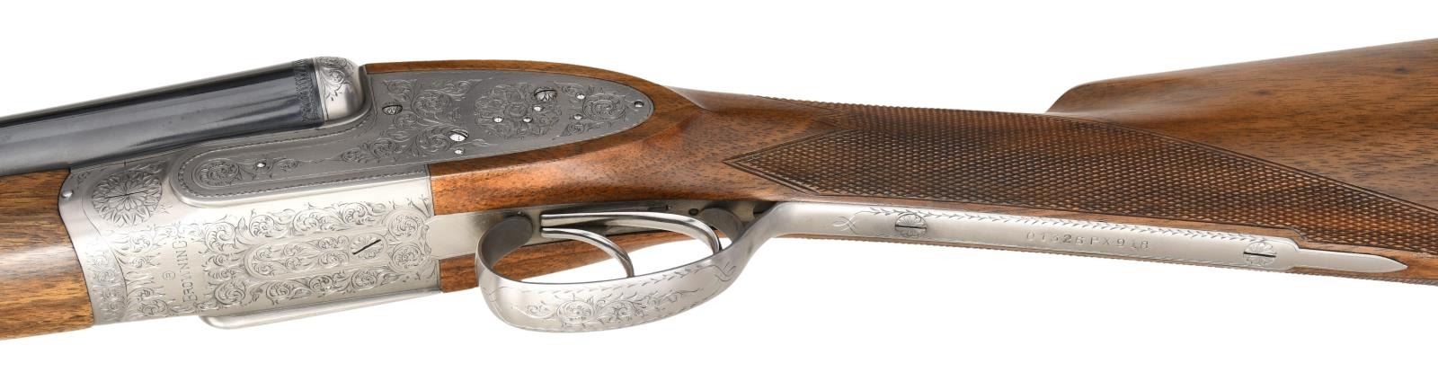 Cal. 12 Ga. 2-3/4". S# 01326PX918. The 28" barrels with narrow game rib have Utah and Montreal addresses along with steel, chamber and gauge info on sides of barrels in addition to "MADE IN JAPAN". Barrel flats with Japanese nitro proofs are marked for IMod and IC chokes. Coin finished sidelock action features automatic safety, grooved tumbler end cocking indicators and double triggers. Action and lock plates are engraved with 80% coverage large scroll with rose bouquet highlights. "BROWNING" is on bottom of action. S# is on trigger guard tang. Somewhat marbled European walnut straight grip buttstock measures 14-3/8" over black leather covered pad. Grip is nicely checkered in point pattern and a vacant silver oval is on toeline. Matching splinter ejector forend has Anson release. MEASUREMENTS: BBLS: STOCK: DAH: 2-1/2". DAC: 1-9/16". CAST: neutral. LOP: 14-3/8". WEIGHT: 6 lb. 11 oz. with brown leather hand protector. UNATTACHED ACCESSORIES: green canvas leather trimmed takedown carrying case by L.L. Bean. CONDITION: extremely fine. Shows relatively little use with only a few minor handling marks mostly in wood finish. Bores are bright and shiny. Mechanically fine. (23-4658/MGM). MODERN. $3,000-4,000.