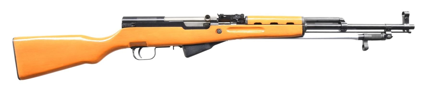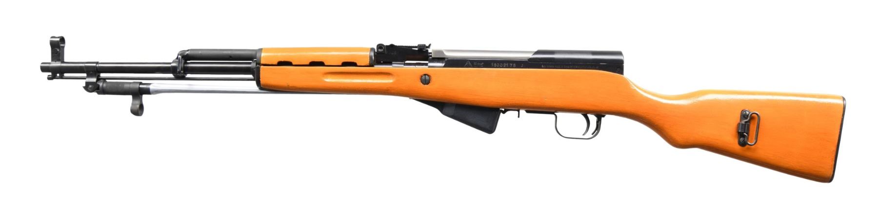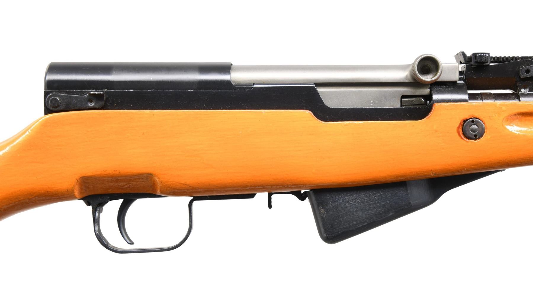 Cal. 7.62x39. S# 18002178J. All visible numbers match. Bbl. 20 1/2". According to the collectors guide to the SKS by Layman, these rifles are seldom seen. The S# seems to indicate a mfg. date of 1975. The receiver is marked on the left side with the triangle 316 followed by three Chinese characters. Import mark on left side of receiver. Tangent rear sight graduated to 1,000 meters. Post front sight with protective hood. Cleaning rod is present. 12 1/4" folding spike bayonet. The unmarked hardwood stock set has a distinctive orange finish. The buttstock has the correct left side swivel. UNATTACHED ACCESSORIES: matching cardboard shipping box. CONDITION: all aspects of wood and metal are near excellent with only tiny scattered handling marks. Very good, shiny bore with sharp lands. PROVENANCE: from the lifelong collection of Terrence McCarty. (24-442/RW). MODERN. $300-400.