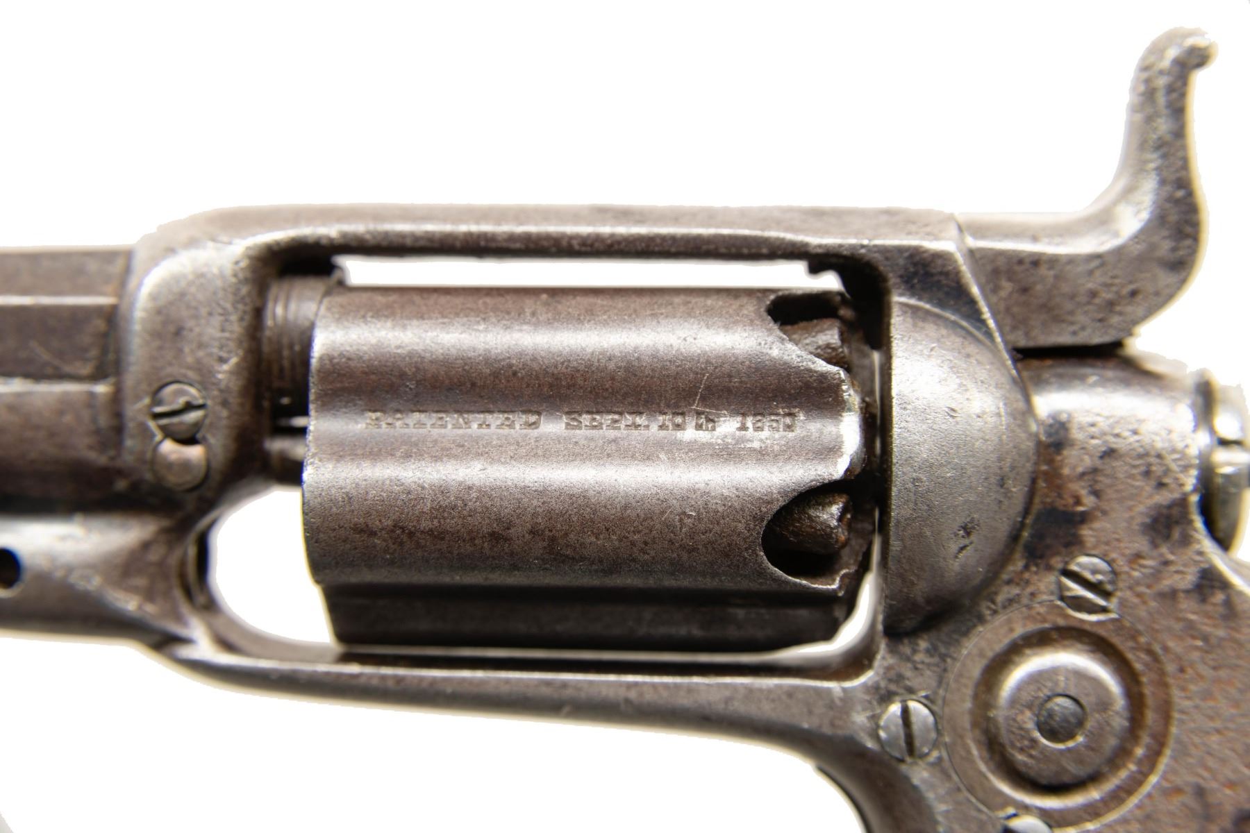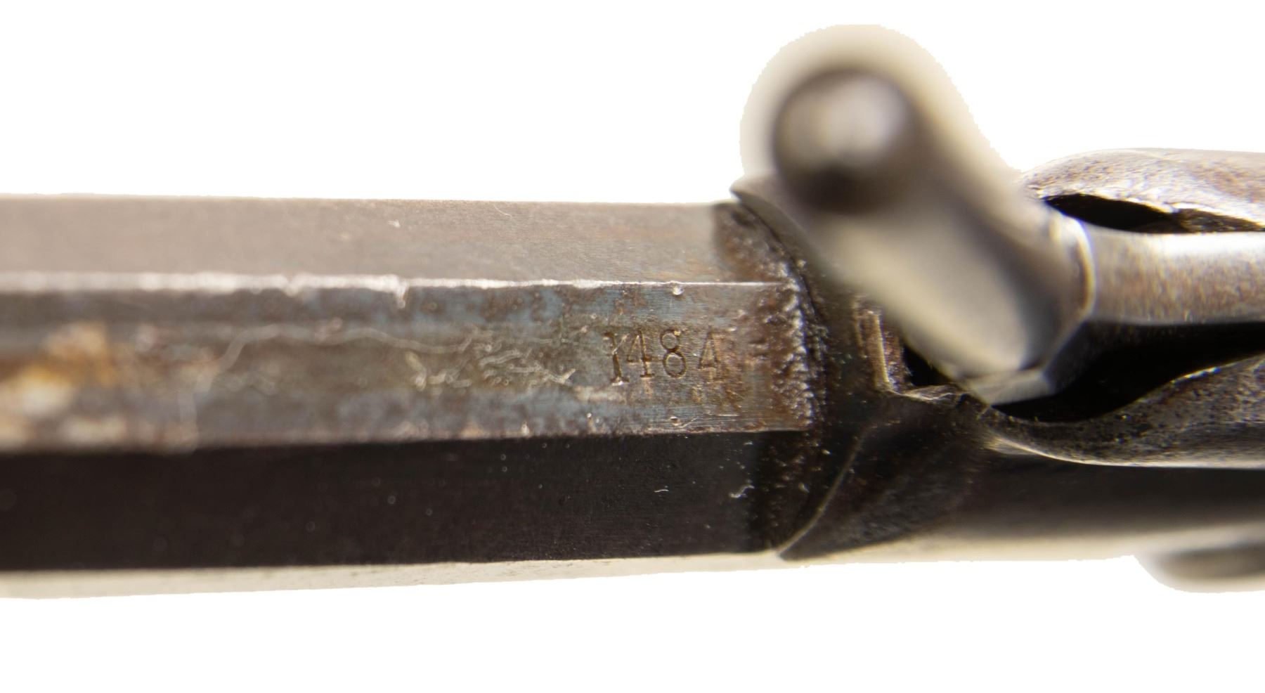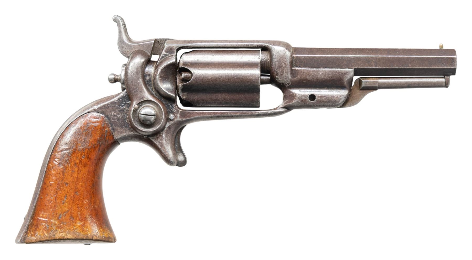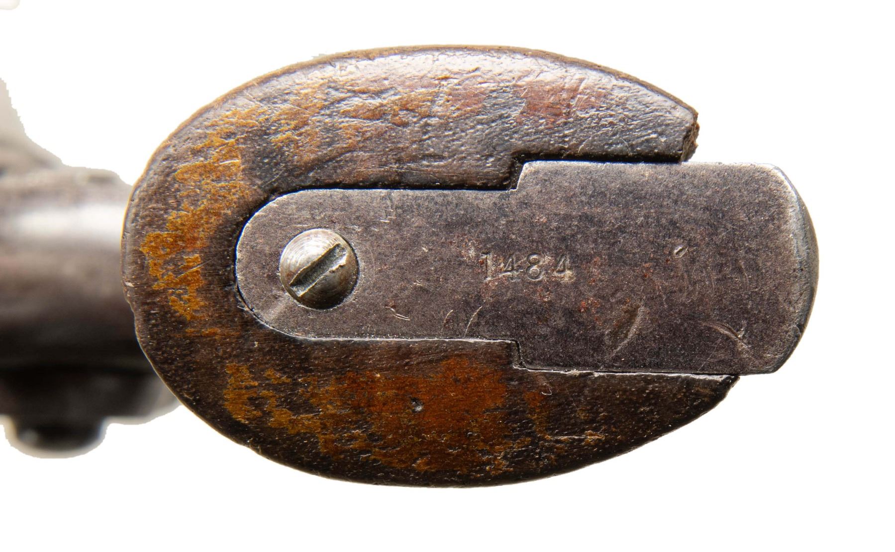 Cal. 31. S# 1484. Revolver has all the distinguishing features of model 4s; fluted 5-shot cylinder; 3.5" octagonal barrel with 2-line patent & address, cylinder has patent stamped in flute, varnished walnut grips, manufactured first year of Civil War 1861. CONDITION: good overall, tiny traces of finish, barrel address is weak, grips chipped with about half their varnish. Mechanically functional, good rifled bore. (01-28502/JS). ANTIQUE. $400-600.