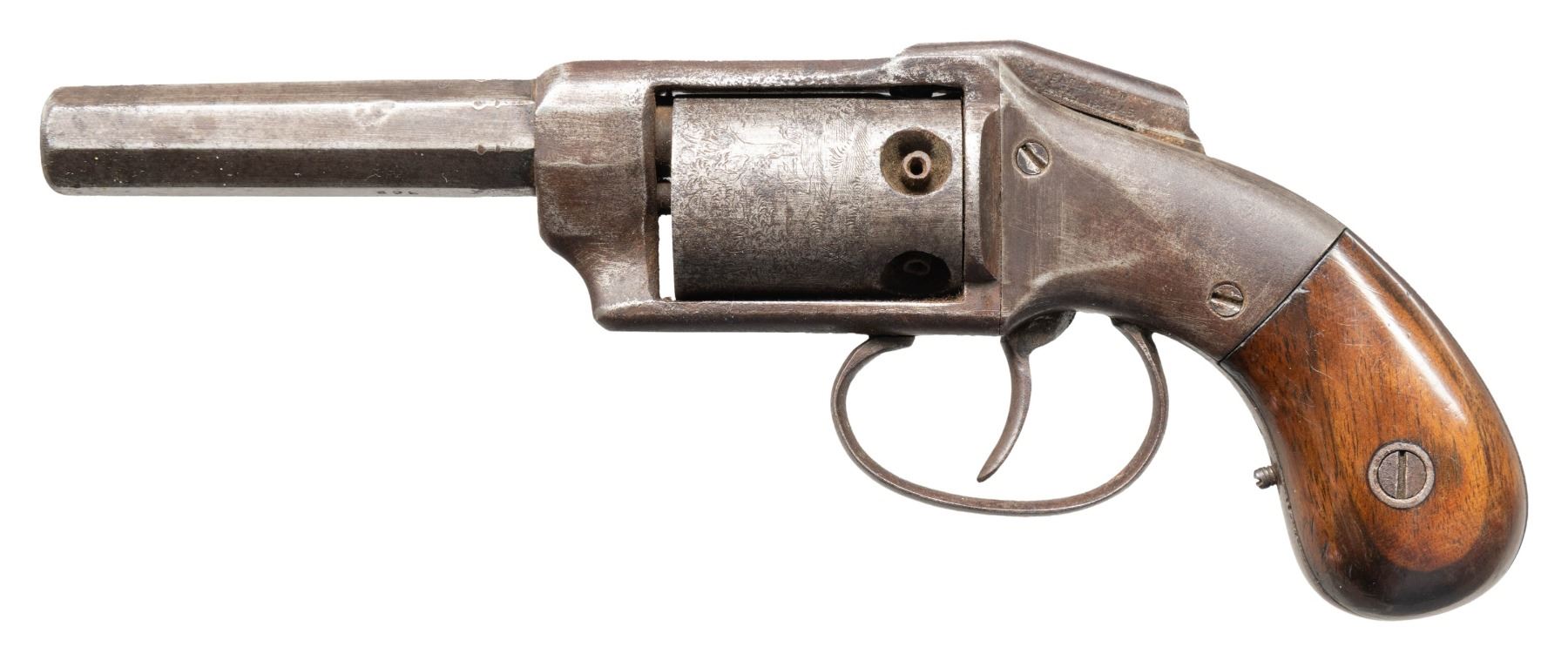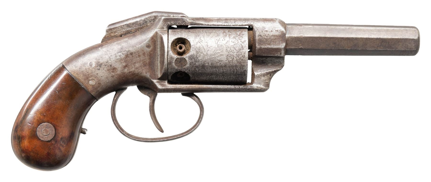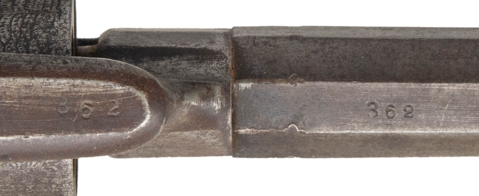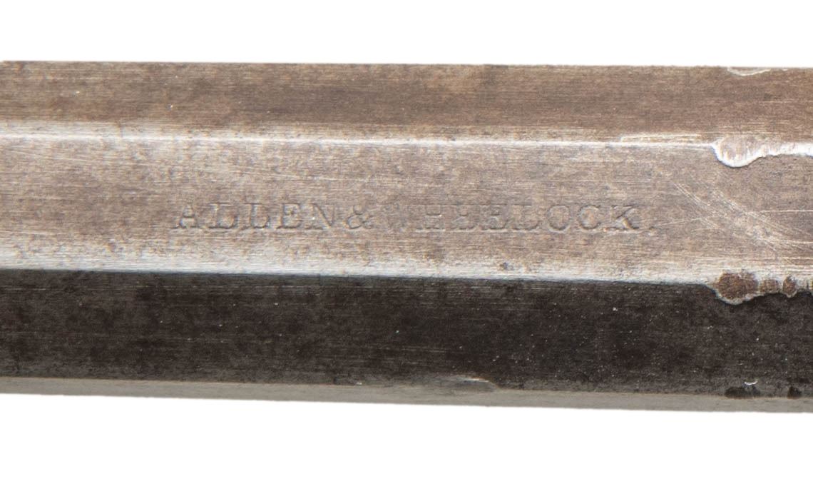 DA REVOLVER. Cal. 31. S# 362. 8.5" overall, 3.5" octagonal barrel stamped "ALLEN & WHEELOCK", 5-shot rolled decorated cylinder, varnished bag grips. CONDITION: good overall, matching & original, mechanics fine, crisp rifled bore. (01-28507/JS). ANTIQUE. $300-500.