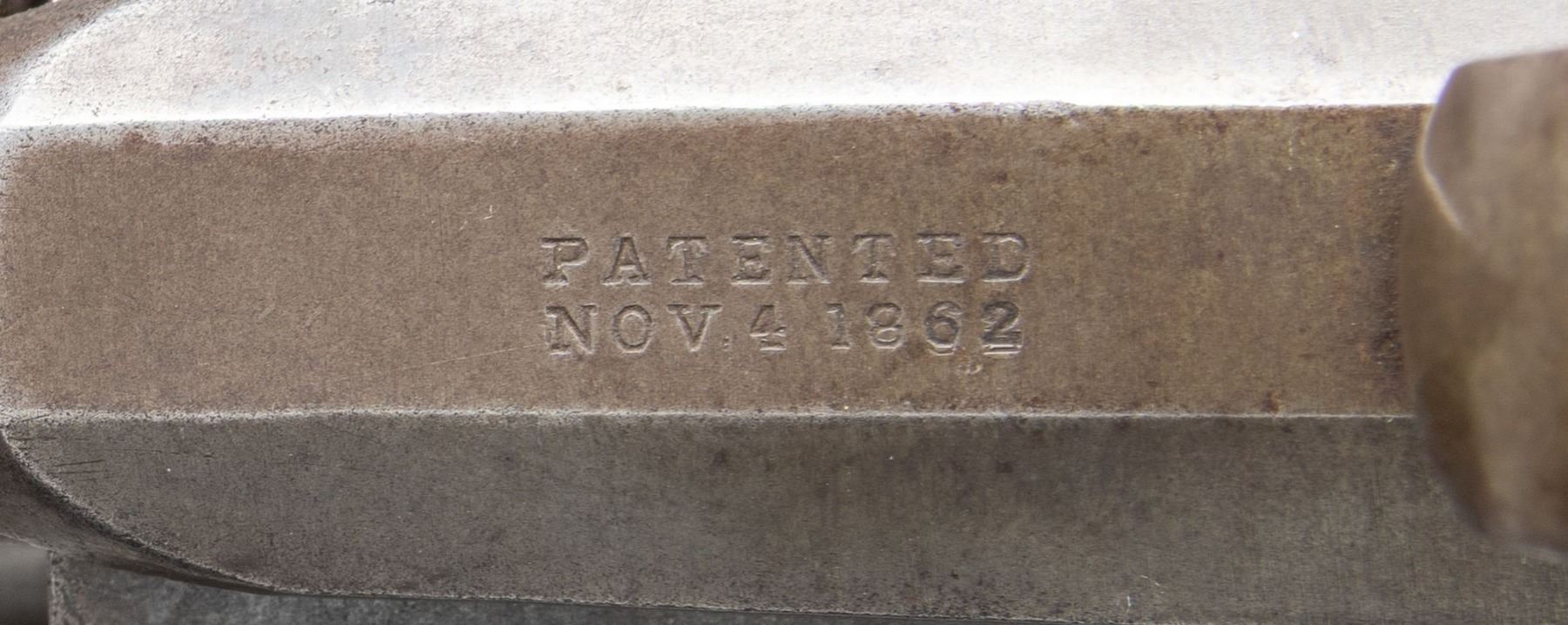 Cal. 44. S# 1755. This unique solid frame hammerless double action revolver was made in small quantities 1862-1863. Several hundred were issued to Michigan cavalry units. Standard configuration. Top of frame marked "PETTENGILLS / PATENT 1858" & "RAYMOND & ROBITAILLE / PATENTED 1858", 7.5" octagonal barrel, bottom of frame stamped "PATENTED / NOV 4, 1862", flared wood grips. CONDITION: very good to fine overall, retaining about 10% original finish, balance silver/gray, grips sound. PROVENANCE: Estate Collection of John "Jack" Dhooghe. (01-28251/JS). ANTIQUE. $3,000-4,000.