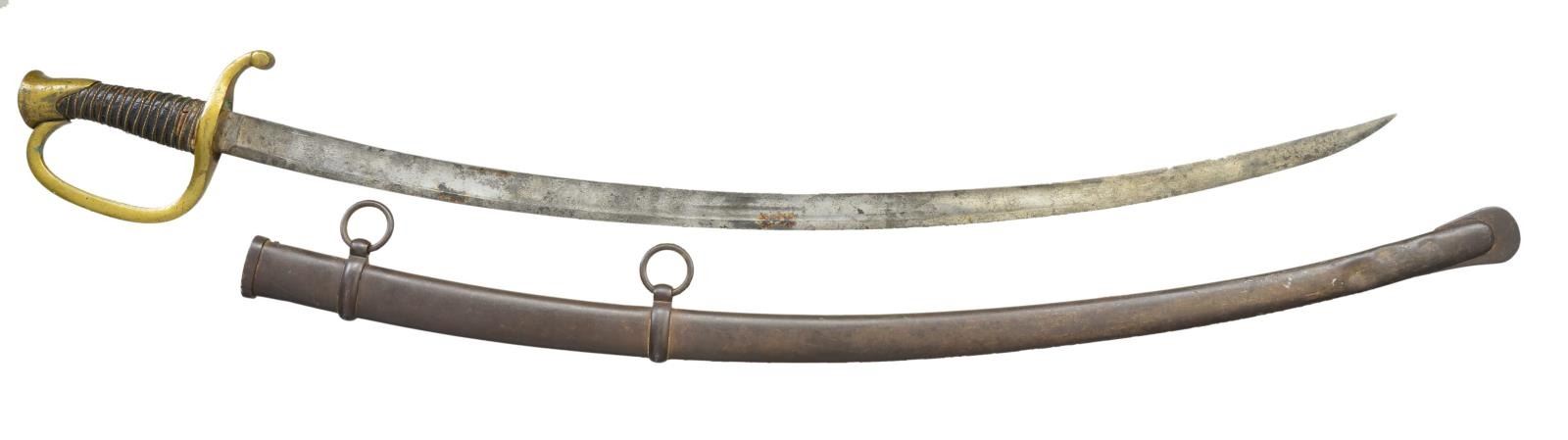 “SHEBLE & FISHER / PHILADa” stamped on ricasso. This firm never obtained federal contract but did supply to local state forces and militias around Philadelphia & New Jersey. CONDITION: very good overall, 32” curved blade retains much of its original luster with staining, leather and twisted wire wrapped grip is mostly intact, worn through at high areas, longitudinal crack. Scabbard fits well but is of type with throat and casting for guard is for throatless variety. (02-19068/JS). $500-700.
