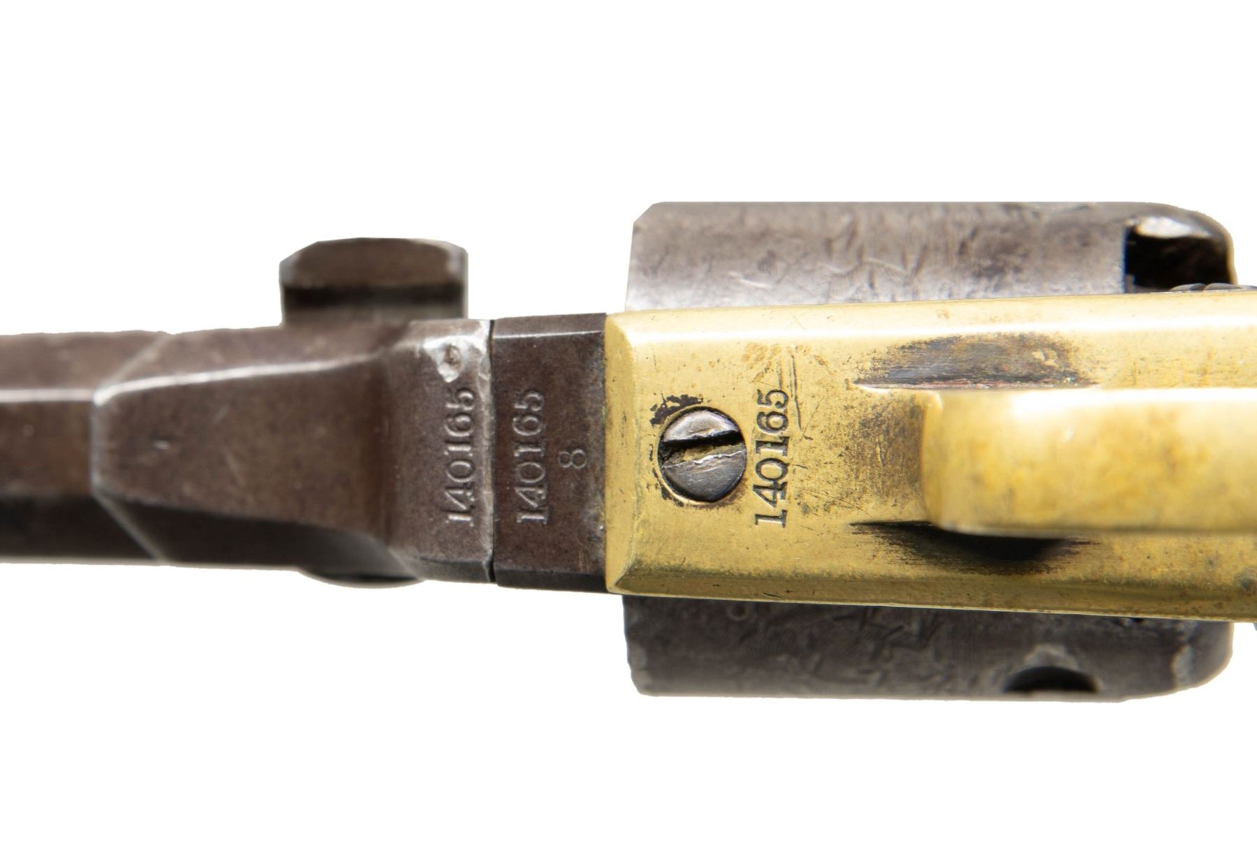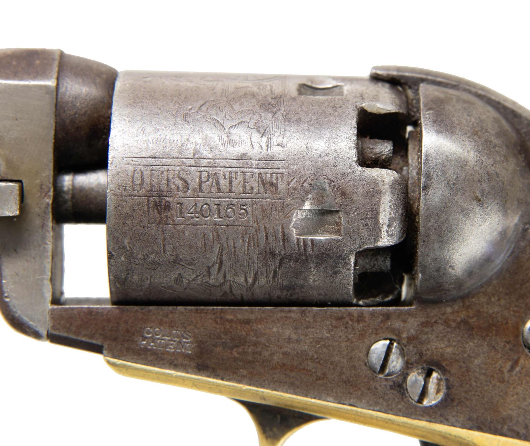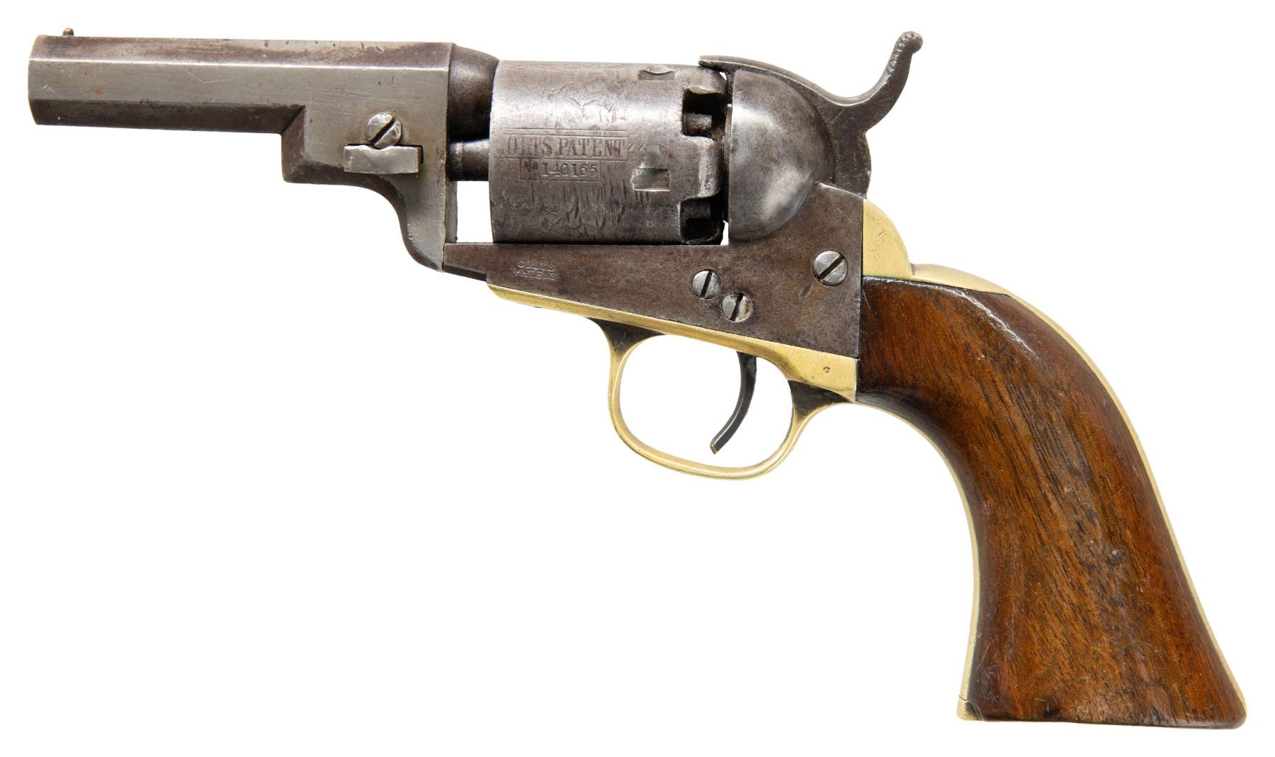 REVOLVER. Cal. 31. S# 140165. Standard configuration, 3" barrel without loading assembly, 2-line New York City address with brackets, small brass cone front sight, 5 shot cylinder with stagecoach holdup rolled scene, "COLTS PATENT" stamped on frame. Silver plated brass trigger guard & backstrap, varnished walnut grips. Manufactured 1858. CONDITION: very good overall, all original & matching, no finish, metal is overall gray/plum, mostly discerned cylinder scene, mechanics functional, good rifled bore with pitting. PROVENANCE: Estate Collection of John "Jack" Dhooghe. (01-28253/JS). ANTIQUE. $1,200-1,800.