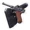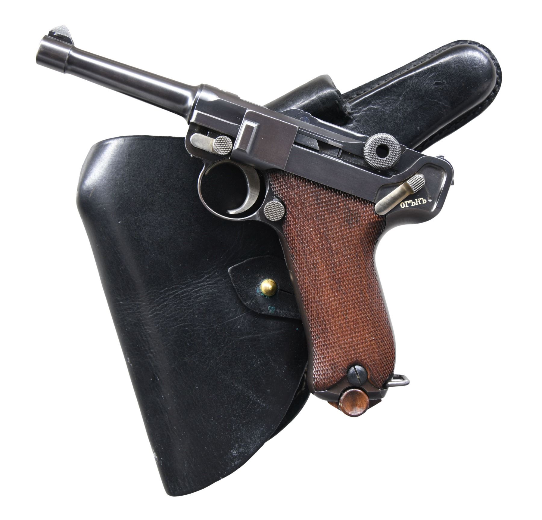 M1911 LUGER SEMI-AUTOMATIC PISTOL WITH HOLSTER. Cal. 9mm Luger. S# 380c. Bbl. 4". 1 of approx. 10,000 M1911 Luger mfg. by DWM under contract for Bulgaria. 2 groups of 5,000 M1911 Lugers were ordered from Bulgaria, with this example, falling within the 2nd Series, exhibiting a "C" suffix to the S#. The top of the chamber is marked with the intertwined "DWM" monogram, with the Bulgarian Coat of Arms marked over the top of the forward toggle link. Right side of the bbl. extension is marked with a Bulgarian Rampant Lion acceptance proof. Safety marking (on frame) and extractor are both properly marked in Cyrillic. Metal components exhibit a professionally reapplied blue finish, with strawed parts having been reheated. Frame is mounted with 2-piece checkered wood grips. Frame features its distinctive lanyard ring at the bottom of the rear grip strap. Matching numbers are present on the frame, takedown lever, sideplate, trigger, safety lever & bar, bbl., bbl. extension, trigger bar, breechblock, as well as on the toggles. Grips are unnumbered. MAGS: 2 8-rds. UNATTACHED ACCESSORIES: Bulgarian black leather holster. CONDITION: extremely fine, as professionally restored, with metal components retaining bountiful amounts of their reapplied finishes overall, exhibiting some scattered spots of light pitting beneath the finishes. Very bright bore (as refinished), exhibiting consistent mild pitting, while retaining strong rifling throughout. Grips are very good, showing mild smoothing overall. Holster remains malleable, exhibiting some wear, while remaining sturdy and serviceable. An extremely attractive example of a professionally restored Bulgarian M1911 Luger pistol. (24-6910/MLW). CURIO. $3,000-4,000.