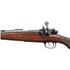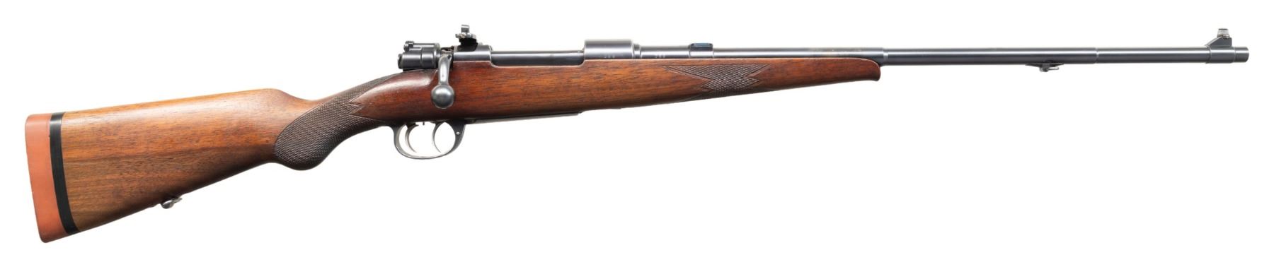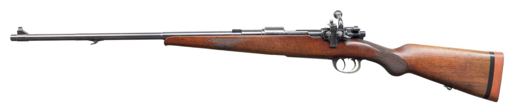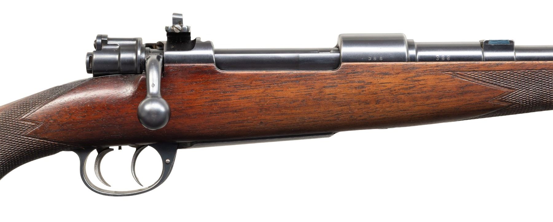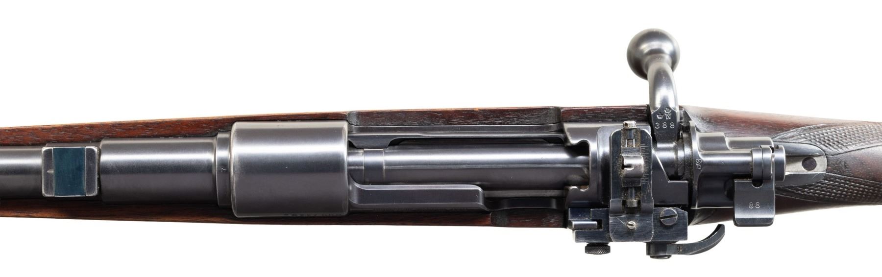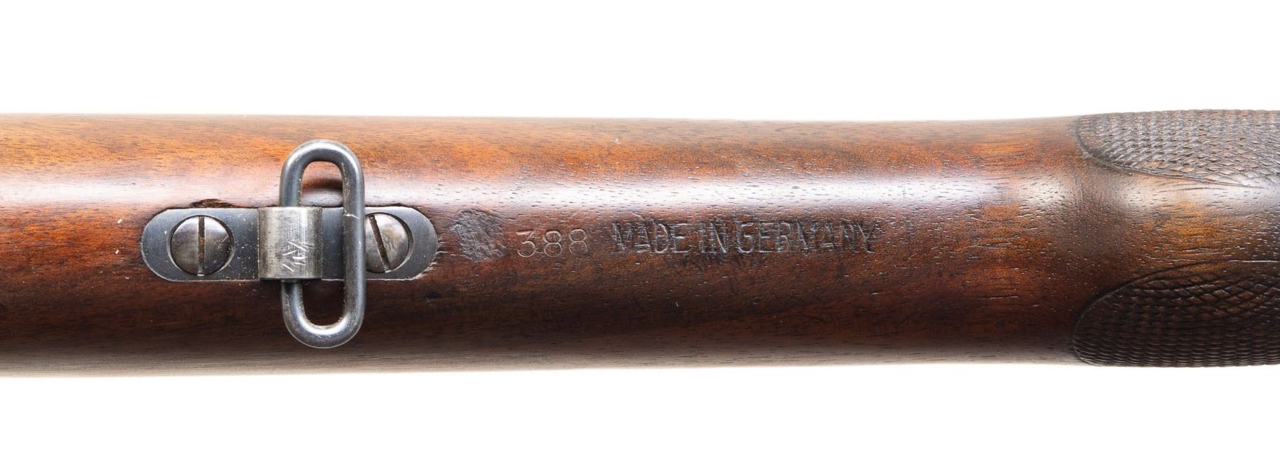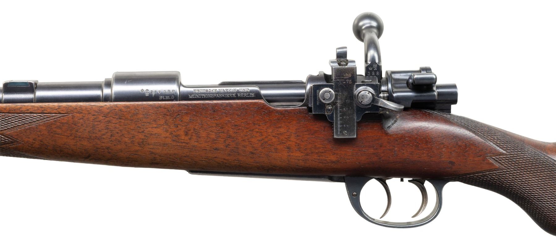 RIFLE. Cal. 7x57mm. S# 388. Bbl. 22 1/4". Utilizing remaining on hand M93 Spanish Mauser rifle actions, DWM built several hundred (exact number unknown) sporting rifles to include with military rifle shipments to African and South American countries, as was common practice during the early 20th century. Deemed "Pelizer" (Pleasure) rifles, these were often included as a "gifts" for the foreign decision making officers, which has led to them frequently being coined as "bribe" guns. This example is marked with a crown, followed by a Crown/N commercial nitro proof (crown proofs repeated on underside of bbl. and on top of bolt root), "257", and "G.B.P./ St.m.G" on the left side of the chamber, with a partially visible "M", followed by the S# "388" marked on the right side. Left receiver wall is marked "DEUTCH WAFFEN-UND/ MUNITIONSFABRIKEN, BERLIN". Toeline of stock is marked "388 MADE IN GERMANY". Metal components exhibit a blue finish overall, save for on the interior of the receiver, which is polished in-the-white. 1-piece checkered wood pistol grip stock features a schnabel tip forend, a wrap around checkered panel at the forearm, checkered panels on either side of the wrist, 2 added black synthetic spacers, as well as an added red rubber recoil pad. Toeline of stock features an inletted sling swivel, with an integral sling swivel present on the underside of the bbl. 1-piece trigger guard featuring a hinged floorplate (appearing to utilized from remaining Model 1909 Argentine contract rifles), with adj. double set triggers. Dovetailed natural white beaded blade front sight on banded sight base, with a dovetail blank in the rear sight slot. Bolt stop housing is fitted with a Lyman No. 35 adj. aperture rear sight. All serialized parts are matching and include the receiver, bbl., trigger guard (on left side below wood line), bolt assembly, as well as the stock. LOP: 13 3/4". CONDITION: very good, with metal components retaining the vast majority of their original factory blue finish overall, exhibiting spots/areas of light to mild wear and thinning, some superficial handling marks, as well as a couple of scattered spots of light to mild surface oxidation that is present on the receiver bridge. Trigger guard and floorplate exhibit areas of thinning and wear that are fading to gray and brown patinas, with the floorplate also exhibiting consistent light pitting overall. Bright bore, exhibiting light pitting, while retaining well defined rifling throughout. Proper manual mechanics, to include the double set triggers. Stock shows scattered marks and minor impressions from handling and storage, but otherwise remains very good overall. A very attractive example of a relatively unknown DWM Mauser rifle variation with a unique history. PROVENANCE: From the Buckstix Collection. (25-6723/MLW). CURIO. $1,500-2,500.