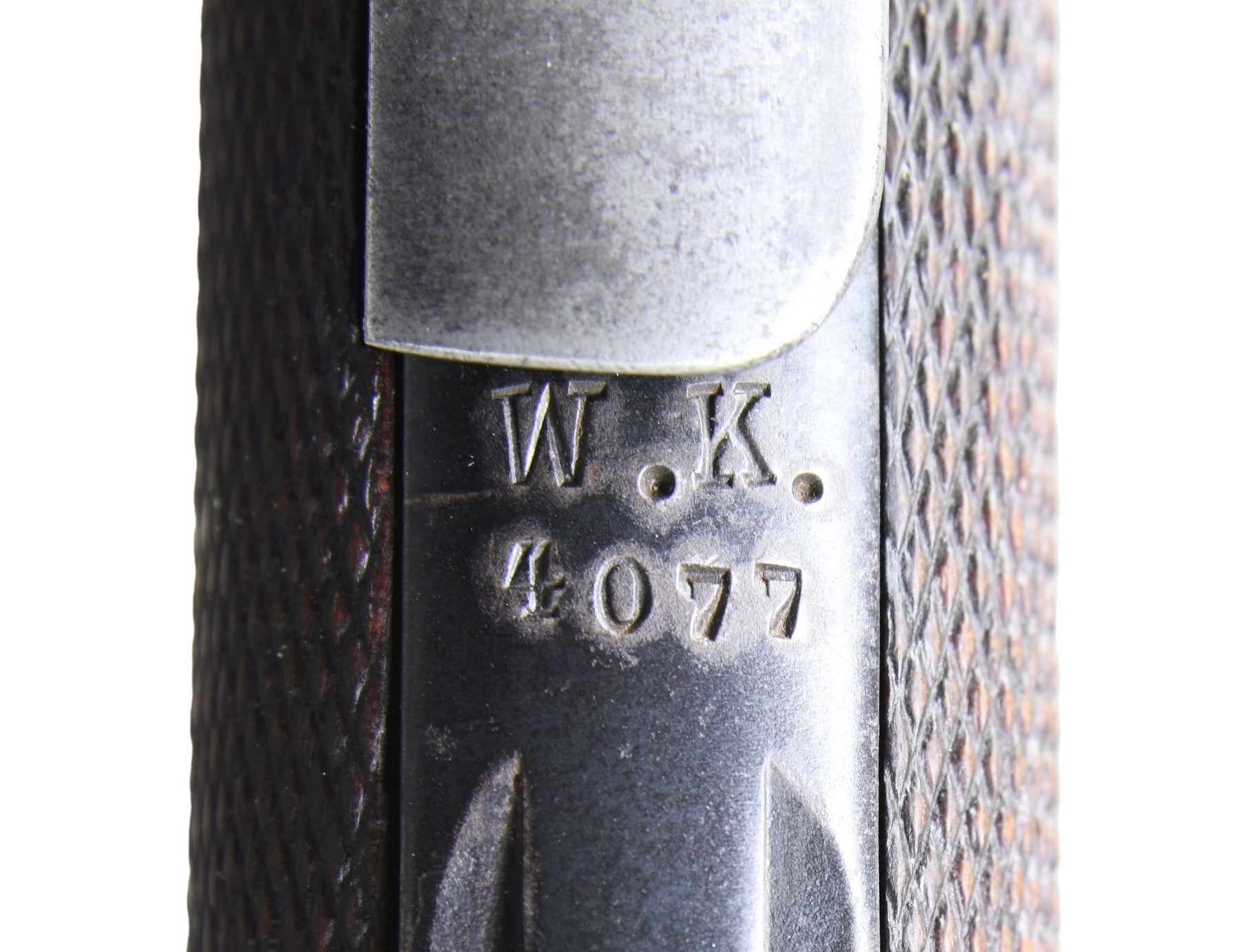 SEMI-AUTOMATIC PISTOL. Cal. 9mm Luger. S# 8237a. Bbl. 5 7/8". Originally mfg. as a standard Model 1906 (2nd Issue) Navy Luger, this example was subsequently refurbished and sold commercially after the conclusion of World War I. The bbl. extension is marked with Imperial German navy proofs on the left side, which are also present on the left side of the bbl. and breechblock. Toggle is marked with the intertwined "DWM" monogram. Underside of frame is stamped "GERMANY" just ahead of the trigger guard, with German Kriegsmarine Kiel "W.K./ 4077" unit mark present on the backstrap. Metal components exhibit what appears to be a period reapplied blue finish overall, with strawed parts also appearing to have been reheated at the same time. Frame is mounted with 2-piece checkered wood grips. Standard blade front sight, with Navy rear sight graduated from 100-200. All serialized parts are matching in the commercial fashion and include the frame, takedown lever, sideplate, trigger, grip safety, bbl., bbl. extension breechblock, and toggles. Grips are unnumbered. MAGS: 1 wood spuriously matching wood bottom 8-rd. CONDITION: metal components retain the majority of their period reapplied blue finish, exhibiting some areas of wear and thinning that show through to gray patina, as well as some spots of light to mild surface oxidation and pitting present overall. Bbl. and bbl. extension exhibit light to mild pitting beneath the bluing. Grip safety retains a mottled gray patina. Strawed parts are very good, showing some wear and thinning, with the trigger exhibiting areas of age related discoloration. Near mirror bore, exhibiting areas of light pitting, while retaining well defined rifling throughout. Grips show mild smoothing, but otherwise remain very good overall. Left grip panel exhibits a crack on the interior at the top right corner by the safety lever. (24-6819/MLW). CURIO. $2,000-3,000.