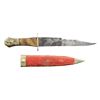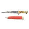 12" overall, 8" clip point blade, 2-stage 4.5" sharpened clip, "G WOODHEAD / 36 HOWARD STREET / SHEFFIELD" on ricasso, 2.5" heavy German silver cross guard, full tang, horn slab grip, full recumbent lion solder filled pommels. Gold decorated red veneered German silver mounted sheath. CONDITION: very good overall, blade has old sharpening, reducing width of blade slightly, staining & light pitting, several small holes in horn. Accompanying Sheffield sheath is complete. PROVENANCE: Bill Wright collection; Cowan auction 2012; Larry W. Williams lifetime collection. (02-23269/JS). NON-GUN. $1,500-2,500.