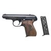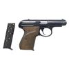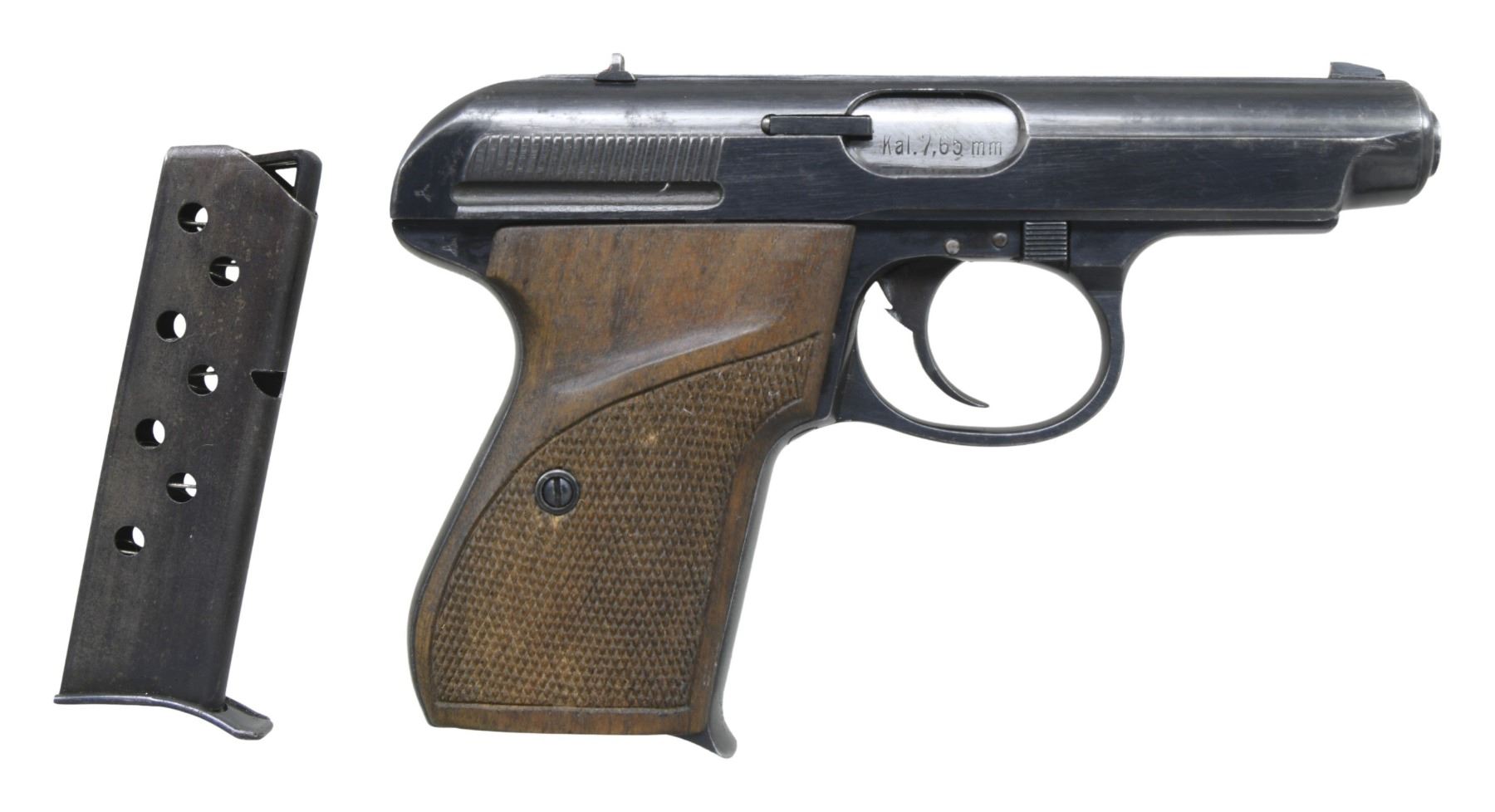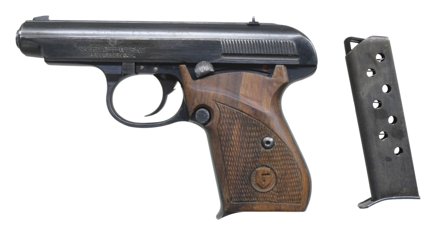 PISTOL. Cal. 7.65mm. S# 1179. Bbl. 3 3/4". Near the end of WWII, Gustloff, along with other companies looked for ways inexpensively increase their production of small arms. Although there were several variations of the Gustloff pistol, it is estimated that fewer than 300 pistols were ultimately completed to include all variations with respect to alloy frame/ steel frame, molded grips/wood checkered grips, etc. All had an complex safety and decocker mounted on the left side. This steel frame pistol has fixed front sight (white paint) and drift adj. rear sight (red paint) mounted on a shallow matte rib. Left side of the slide is marked with the Gustloff name and its location in Suhl. Right side of slide is marked with an Eagle/N that is repeated on the right side of the bbl. near the muzzle, and on the right tang. The right side of the bbl. hood is marked with the caliber. Full S# on the left side of frame, with the last few digits repeated over the firing pin housing, on the hammer, interior of slide, and on the inserted plate into the left side of the frame. Fitted with wood checkered panels, the left side fabricated with an encircled "G" within the checkered field. Button mag. release. Mag., electro-penciled "79" on bottom of spine, having 7-indicator holes and a curved detachable floorplate. MAGS: 1 8-rd. CONDITION: VG+ original finish to include the wood checkered grips. Comparable condition mag., though the floorplate may be a replacement. Near mirror bore. Correct manual mechanics. A scarce and highly sought after pistol made late in WWII that is seldom offered for sale. (25-3464/LMA). CURIO. $6,000-9,000.