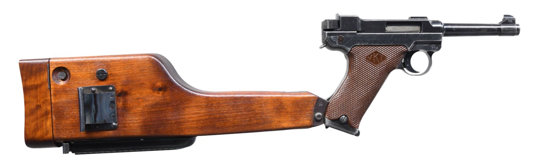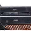 L-35 SEMI-AUTOMATIC PISTOL WITH REPRODUCTION STOCK HOLSTER. Cal. 9mm Luger. S# 4941. Bbl. 4 3/4". 1 of approx. 2,000 Series III Lahti L-35 semi-automatic pistols mfg. by VKT and subsequently delivered to the Finnish military in spring of 1944. The top of the bbl. extension features a loaded chamber indicator, and is marked with the VKT arsenal logo above "L-35" and a boxed Finnish "SA" military property mark. Left side of the frame is marked with an encircled "M" proof. Metal components exhibit a blue finish overall. Frame is mounted with 2-piece "VKT" logo inverse checkered brown plastic grips. All serialized parts are matching and include the frame, bbl. extension, as well as the bolt. MAGS: 2 8-rd. UNATTACHED ACCESSORIES: generic black plastic hard case, containing a reproduction experimental stock holder, and 1 spare mag. CONDITION: metal components retain the majority of their original arsenal blue finish overall, exhibiting scattered areas of mild wear and thinning that show through to gray patina, as well as scattered superficial marks from handling and storage overall. Grip straps retain fair amounts of their original blue finish, exhibiting wear and thinning through to gray patina, with some light surface oxidation present on the left side of the frame below the grip panel. Bore is bright, exhibiting areas of mild to moderate pitting, while retaining well defined rifling throughout. Grips are very good, exhibiting a few superficial handling marks, with the left panel exhibiting a small impression. Reproduction stock is excellent overall. (24-6905/MLW). CURIO. $3,000-5,000.