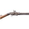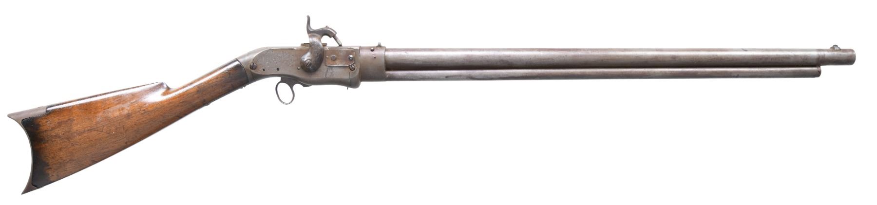 LOADING REPEATING RIFLE. Cal. 54. S# 154. Manufactured in 1851 by Robbins & Lawrence, Windsor, Vermont. Horace Smith later of Smith & Wesson fame and Volcanic arms, patented and improved the action for the 1849 patented Jennings "rocket ball" cartridge. About 500 rifles of this pill primed, ring trigger configuration were made, later improved frame versions made in 1852. Standard configuration with 26" barrel with front loading tube magazine. Light floral scroll engraved frame, barrel, hammer, & buttplate, "ROBBINS & LAWRENCE / MAKERS / WINDSOR VT" and "C P DIXON AGENT / NEW YORK / PATENT 1849" stamped on the left side of frame. UNATTACHED ACCESSORIES: entry from 2018 catalog offering this gun. CONDITION: good overall, interesting presidential seal engraved on butt stock escutcheon. Metal overall is gray, discernible markings, very good multi groove rifling, mechanics need attention, ring trigger is bent, missing top tang screw, refinished and varnished straight grain walnut stock. (01-26410/JS). ANTIQUE. $3,000-6,000.