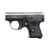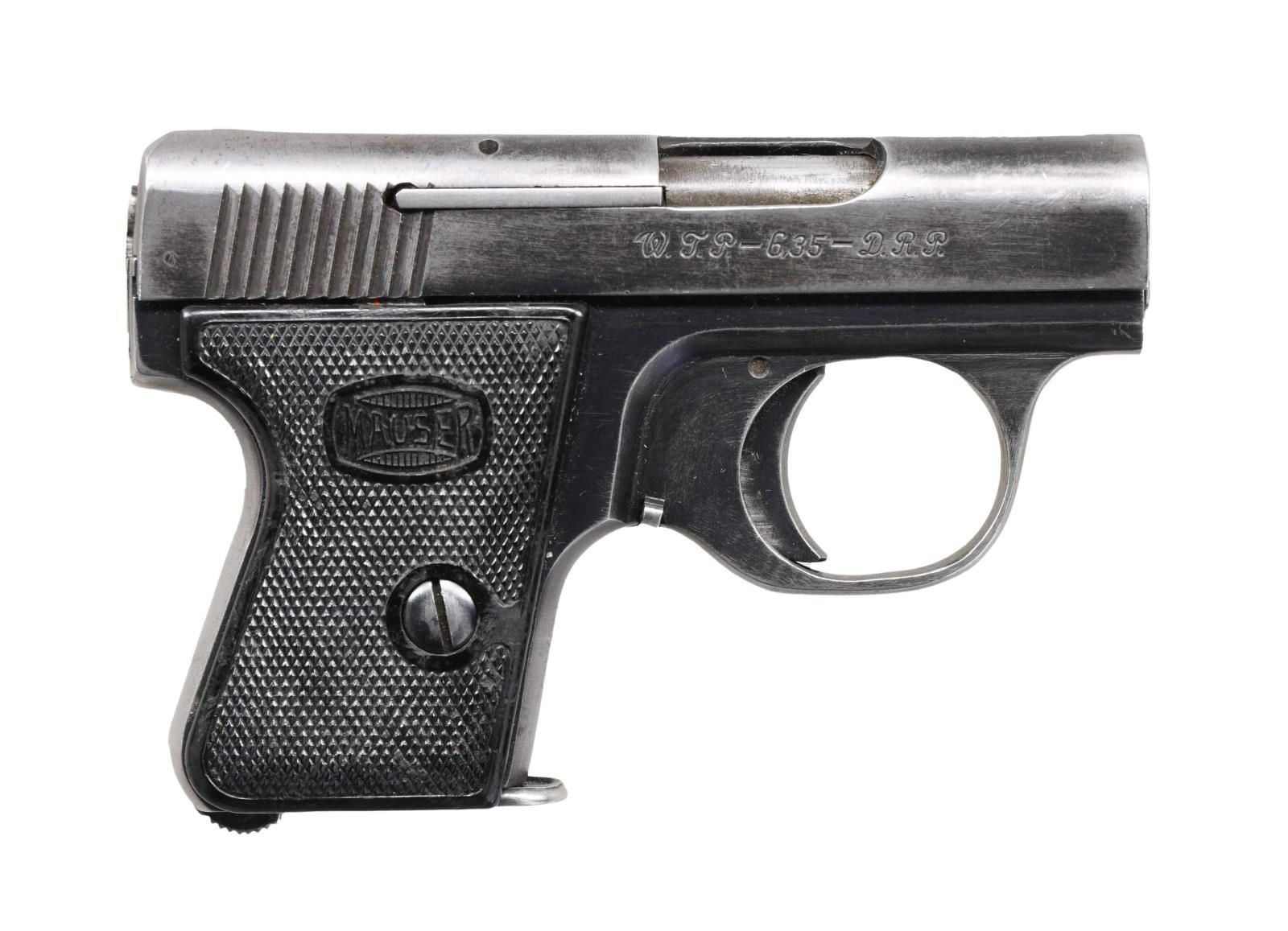 PISTOL. Cal. 6.35mm (25 ACP). S# 134. Bbl. 2 1/8". Low profile sights. Scarce post war assembled WTP II pistol w/o German proofs. The French took over the Mauser Oberndorf factory after WW2 & produced different Mauser weapons including an estimated 1100 WTP II pistols. Rear of slide & frame are numbered matching but other parts appear unnumbered. Left side of slide has script Mauser Oberndorf legend & Mauser Banner. Blue finish. Black checkered grips w/ Mauser Banner logo. Purportedly this gun was carried by a Butte, Montana detective as a backup gun. MAGS: 1-6 rd. CONDITION: grips show some flattened points & scattered handling wear. Metal retains 40% original blue w/ overall fading to gray & some light oxidation. Bore shows scattered dried grease & some oxidation but may clean up better. PROVENANCE: The Collection of Curtis H Halvorson. (23-5831/MJC). CURIO. $300-500.
