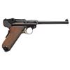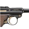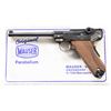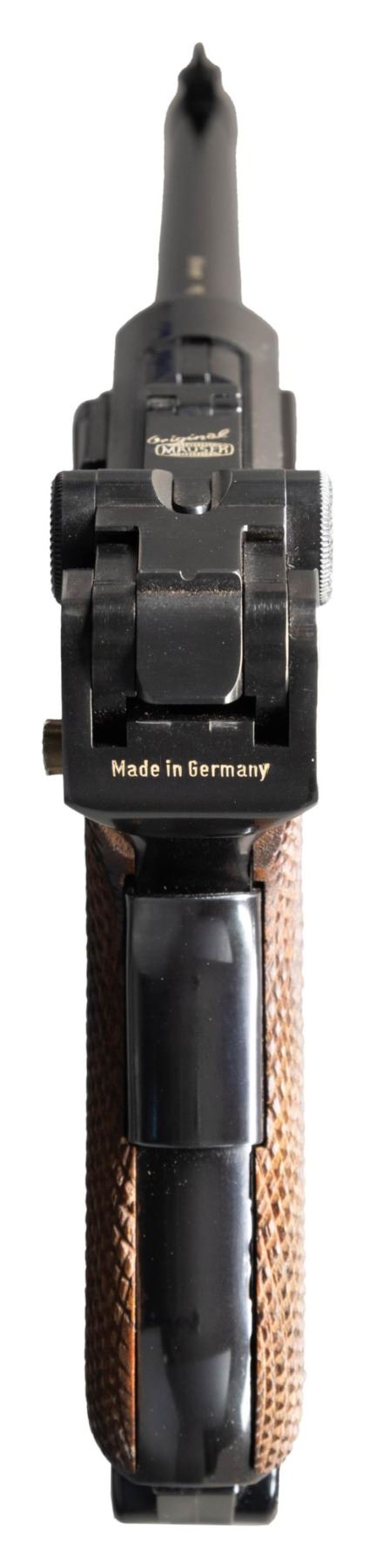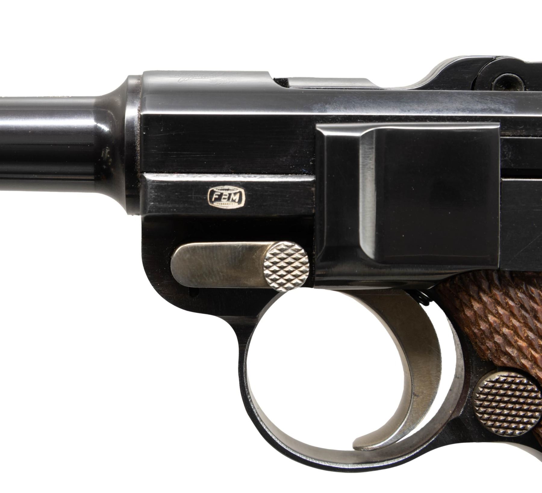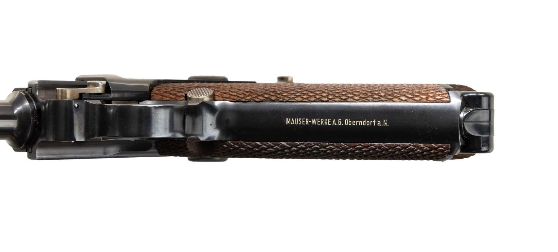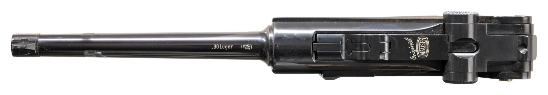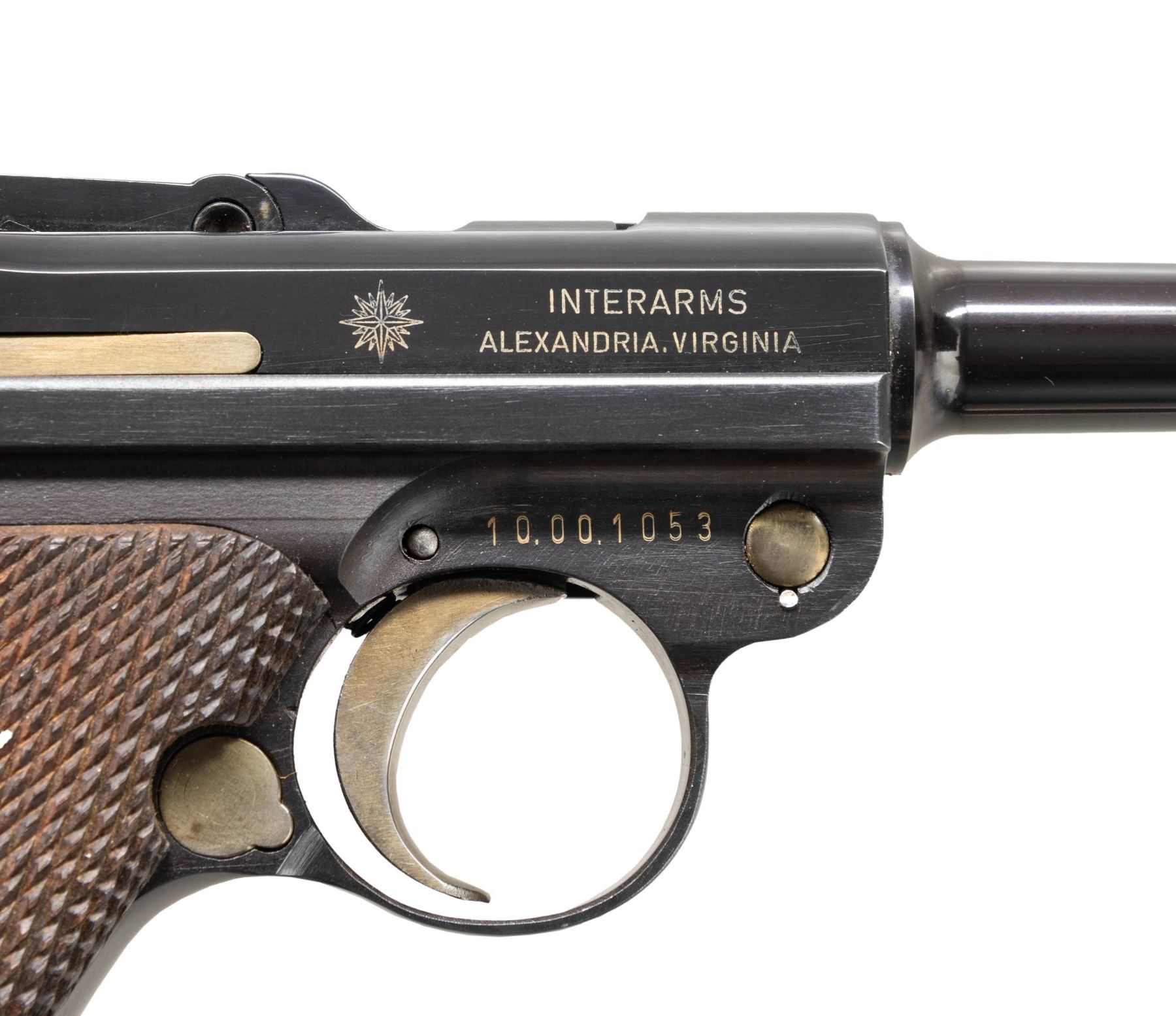 GROUP MODEL 29/70 LUGER SEMI-AUTOMATIC PISTOL WITH FACTORY BOX. Cal. 30 Luger. S# 10.00.1053. Bbl. 6". Extremely early (53rd Original Mauser 29/70 Luger chambered in .30 Luger) Model 29/70 Luger semi-automatic mfg. by Mauser in 1970. According to page 284 of "The Parabellum is Back!", by Mauro Baudino & Gerben Van Vlimmeren, "The first 60 Mauser Parabellums produced in .30 Luger are usually identified by collectors as prototypes. These pistols were produced immediately after the two prototypes. These pistols have the pattern with double dot (10.00.xxxx) and only the frame is numbered (as for the Display Group). This example is marked with the Original Mauser logo on the toggle, with Interarms' importer information marked on the right side of the bbl. extension. Left side of the frame is marked "MAUSER PARABELLUM/ .30 LUGER", with Mauser's mfg. information marked vertically along the front grip strap, and "Made in Germany" marked on the rear of the frame. Top of the bbl. is marked ".30 Luger", followed by an "FBM" within a Mauser banner logo (also present on left side of the frame). Metal components exhibit a blue finish overall, with some small parts including the takedown lever, trigger, safety lever, and ejector exhibiting a straw finish. Frame is mounted with 2-piece checkered wood grips, and features a grip safety. Dovetailed blade front sight, with fixed U-notch rear sight. MAGS: 1 blue 8-rd. mag. with black plastic bottom, marked with the Mauser banner logo on the spine. UNATTACHED ACCESSORIES: non-matching (S# 078v.250B) factory box. CONDITION: fine, with metal components retaining virtually all of their original factory finishes, with the left side of the frame exhibiting a couple of light scratches to the left of the "MAUSER PARABELLUM" marking. (Presumed) Mirror bore, exhibiting a thick layer of grease, while retaining well defined rifling throughout. Grips show some smoothing, but otherwise remain sturdy and serviceable. Box shows some age related discoloration, and some scattered marks from handling and storage, but otherwise remains sturdy and serviceable. PROVENANCE: The Estate Collection of Charles Wagner. (25-458/MLW). CURIO. $1,200-2,000.