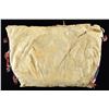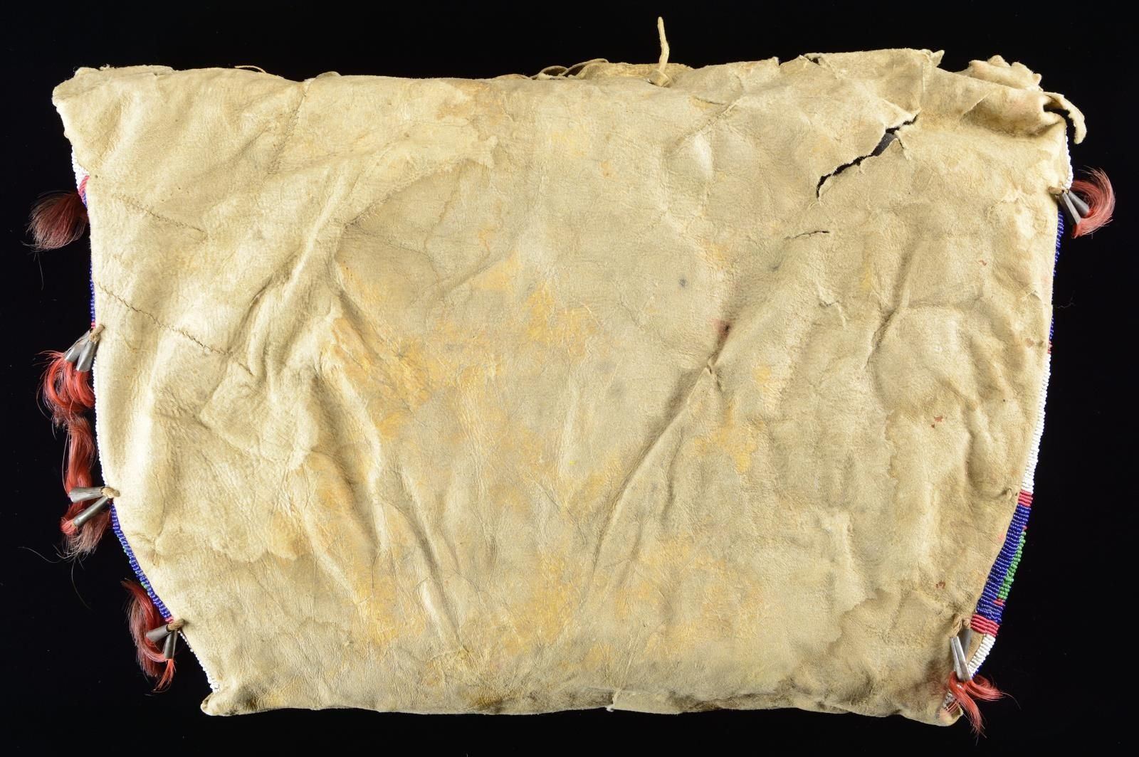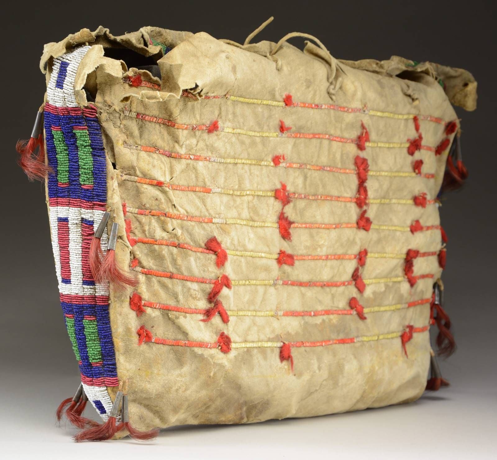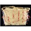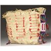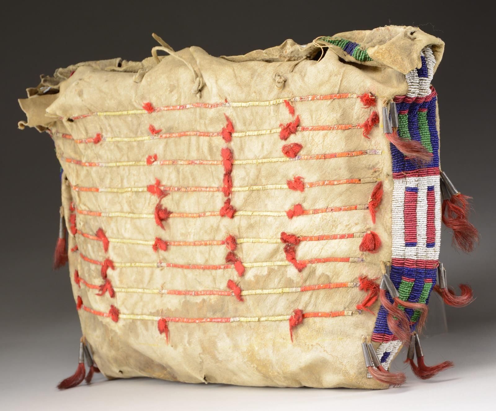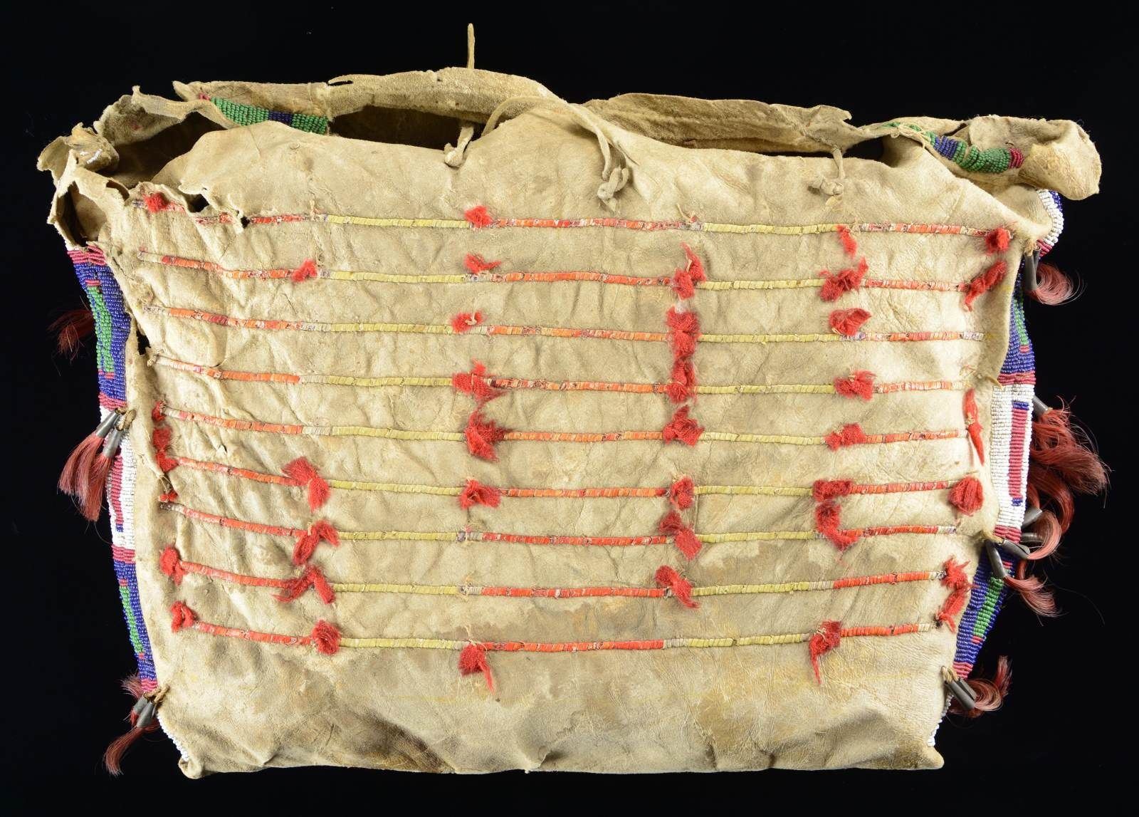 DECORATED TIPI BAG. 21" x 14" x 3", 9 horizontal rows of yellow and orange quilled bands with small pieces of red trade cloth tied in vertical rows. The top flap & edges of bag are bead decorated with whiteheart red, dark blue, green, and white beads. Tinkle cones with red dyed horse hair also trim the beaded sides. CONDITION: fair to good overall, quill work is mostly intact with small losses, about half trade cloth sewn decoration intact, some losses to beads, several tears in leather, water stain at bottom. PROVENANCE: Martin Lane Historic & Western Americana Lifetime Collection. (02-21507/JS). $600-800.