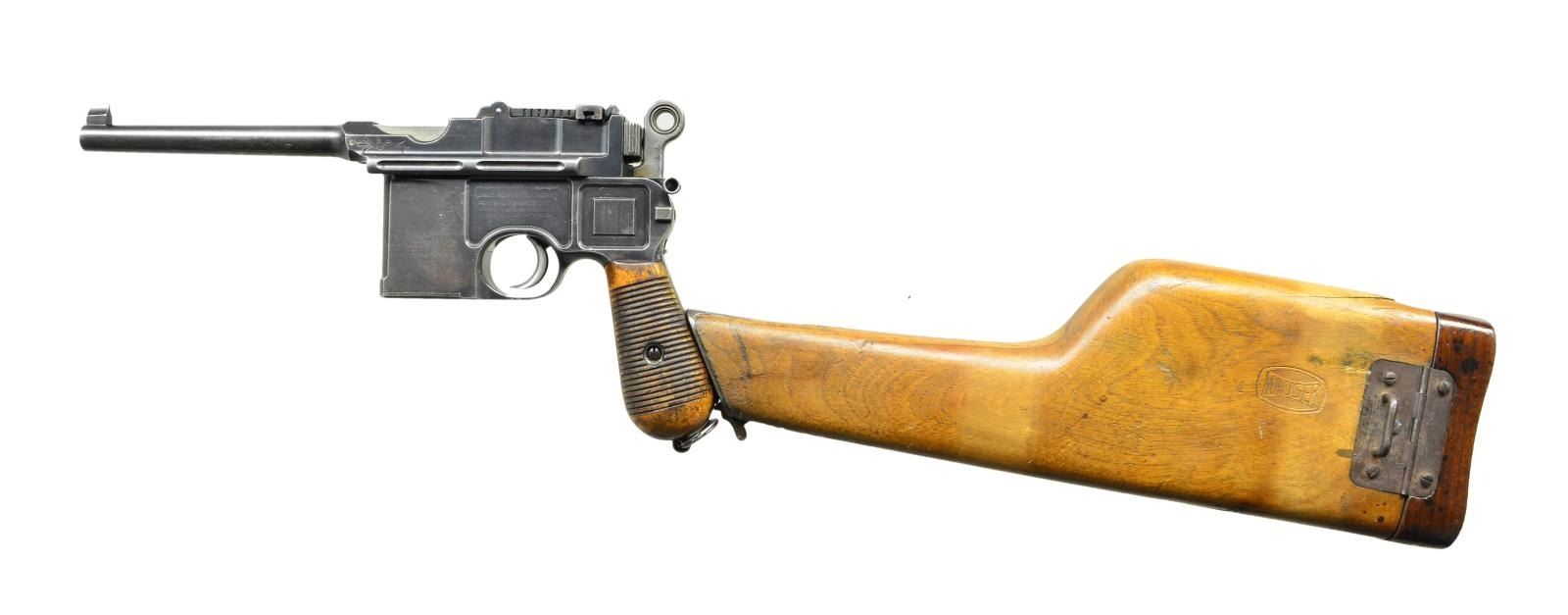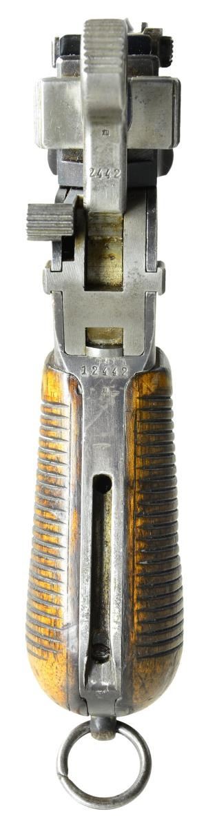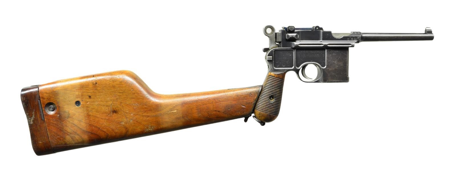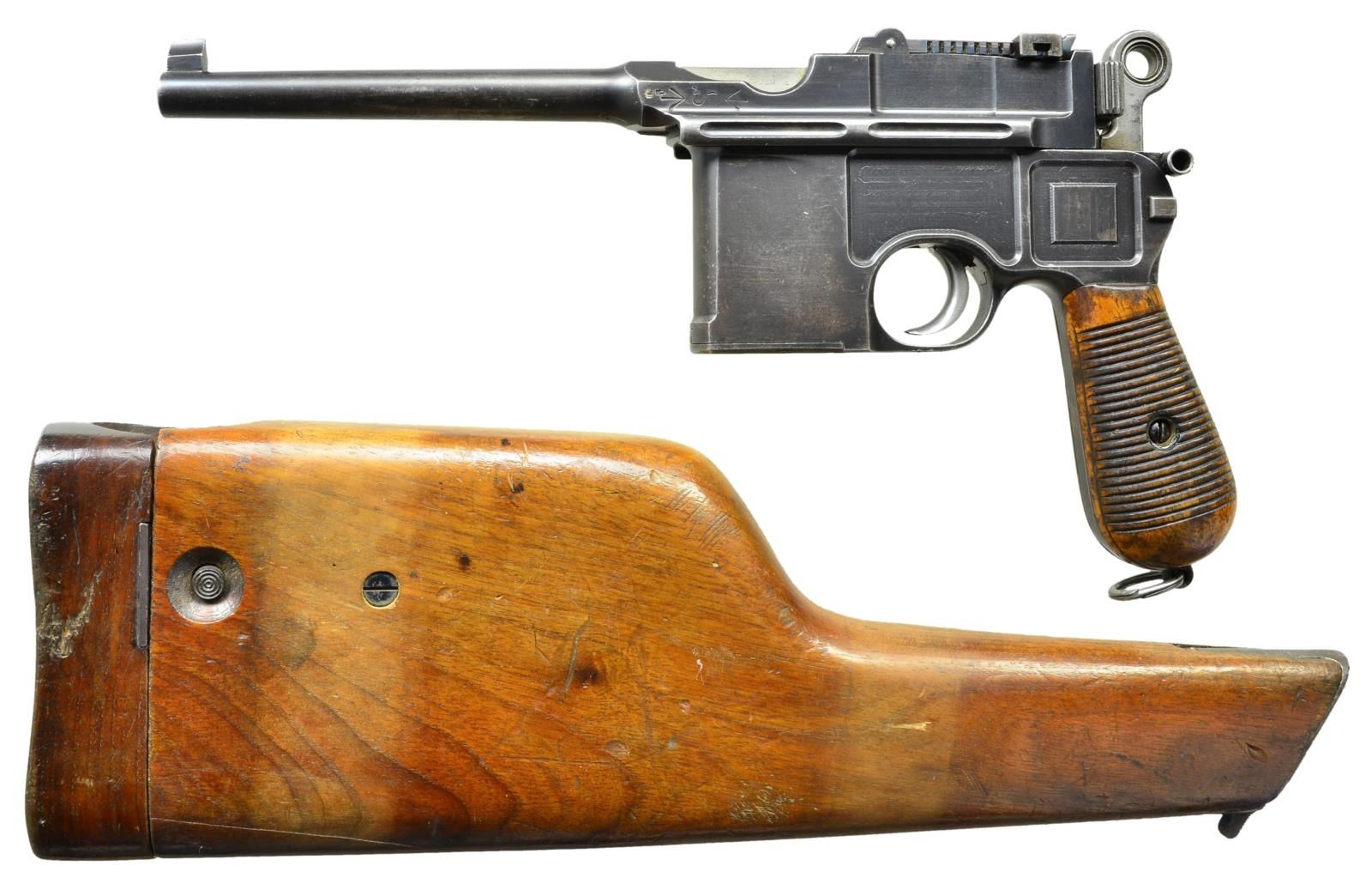 BRITISH MILITARY ACCEPTED WITH SHOULDER STOCK. Cal. 7.63mm. S# 12442. This is an example of Mauser's earliest Large Ring pistols that were assembled using Conehammer bolts and frames, later accepted for use by the British military. The pistol has a 5.5" bbl. w/ a fixed front sight & a pinned 50-500 graduated rear sight. Long extractor, early safety & independently secured firing pin. Top of chamber has the usual Mauser address. Crown/"C"/"U" on left side of bbl. extension; antler proof on right. Full S# is on back of frame. Upon British issue, the left side of the bbl. extension was impressed w/ a pair of bracketing broad arrow markings; British broad arrow acceptance and issue markings are on either side of the barrel extension. Major components rust blued. Most sm. parts fire blued; bolt, hammer, trigger & subframe are in-the-white. Detailed disassembly shows nearly all the usual parts matched w/either full S# or last few digits including firing pin, locking block & each of the serrated wood panels. Floorplate is numbered "8951". Lanyard ring present. UNATTACHED ACCESSORIES: accompanied by a later era Mauser banner shoulder stock w/ lug numbered "464". CONDITION: overall VG, w/ handling marks & fading blue, especially on bbl., front of mag well & front strap, commensurate w/ a pistol that has seen moderate field use. Comparable spotting & wear of the fire blued parts, sight bar having been cleaned along its graduations. Grips with dark oil staining and a scattering of handling marks. Generally bright bore w/ oxidation/roughness in grooves, easily discernable rifling. Perfect manual mechanics. Good stock w/carrier-related discoloration, numerous handling marks, 3" crack at upper spine extending into grip cutout. Hinge & lug w/ considerable oxidation. Pistol fits well in stock, lid closing, but lug will need fitting as it will not fully enter the slot. (01-22328/LMA). ANTIQUE. $4,500-7,500.