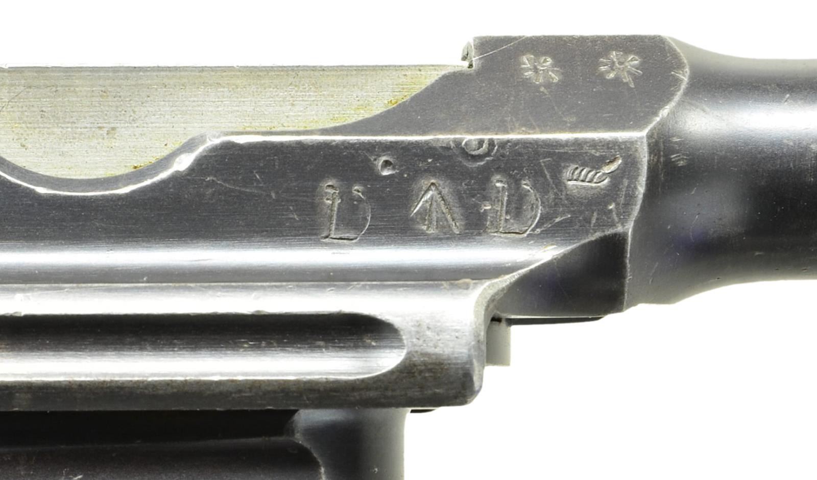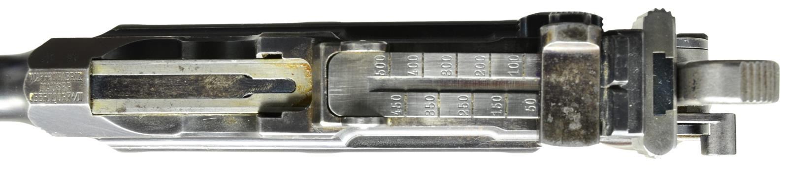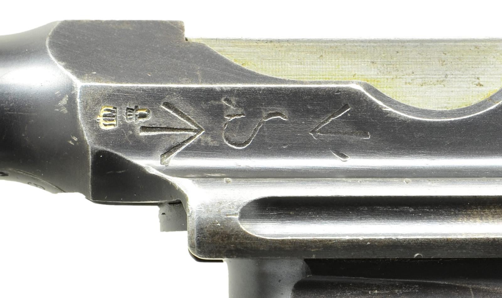 BRITISH MILITARY ACCEPTED WITH SHOULDER STOCK. Cal. 7.63mm. S# 12442. This is an example of Mauser's earliest Large Ring pistols that were assembled using Conehammer bolts and frames, later accepted for use by the British military. The pistol has a 5.5" bbl. w/ a fixed front sight & a pinned 50-500 graduated rear sight. Long extractor, early safety & independently secured firing pin. Top of chamber has the usual Mauser address. Crown/"C"/"U" on left side of bbl. extension; antler proof on right. Full S# is on back of frame. Upon British issue, the left side of the bbl. extension was impressed w/ a pair of bracketing broad arrow markings; British broad arrow acceptance and issue markings are on either side of the barrel extension. Major components rust blued. Most sm. parts fire blued; bolt, hammer, trigger & subframe are in-the-white. Detailed disassembly shows nearly all the usual parts matched w/either full S# or last few digits including firing pin, locking block & each of the serrated wood panels. Floorplate is numbered "8951". Lanyard ring present. UNATTACHED ACCESSORIES: accompanied by a later era Mauser banner shoulder stock w/ lug numbered "464". CONDITION: overall VG, w/ handling marks & fading blue, especially on bbl., front of mag well & front strap, commensurate w/ a pistol that has seen moderate field use. Comparable spotting & wear of the fire blued parts, sight bar having been cleaned along its graduations. Grips with dark oil staining and a scattering of handling marks. Generally bright bore w/ oxidation/roughness in grooves, easily discernable rifling. Perfect manual mechanics. Good stock w/carrier-related discoloration, numerous handling marks, 3" crack at upper spine extending into grip cutout. Hinge & lug w/ considerable oxidation. Pistol fits well in stock, lid closing, but lug will need fitting as it will not fully enter the slot. (01-22328/LMA). ANTIQUE. $4,500-7,500.