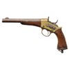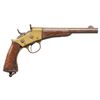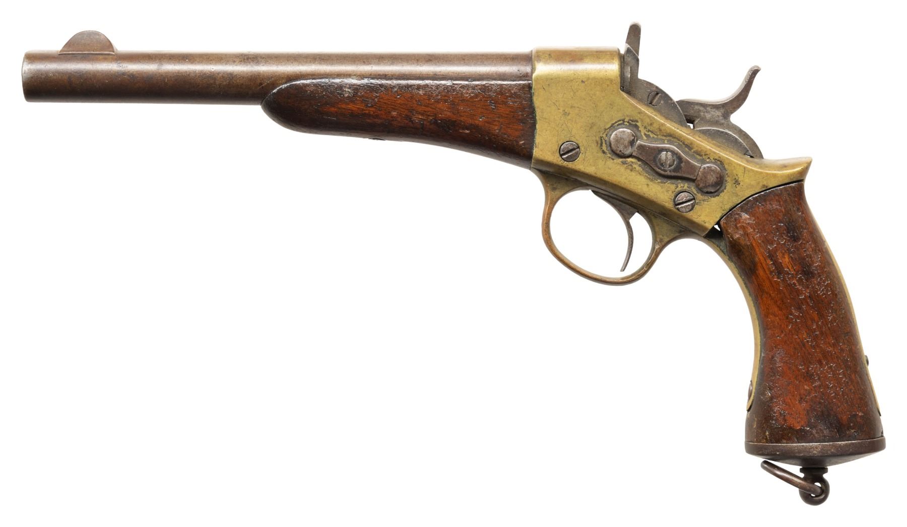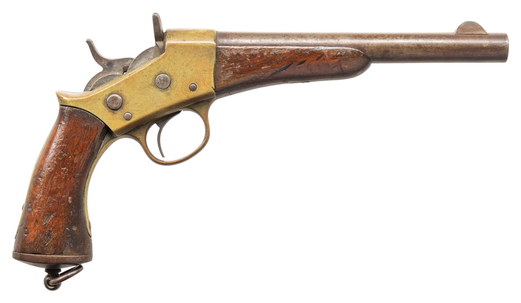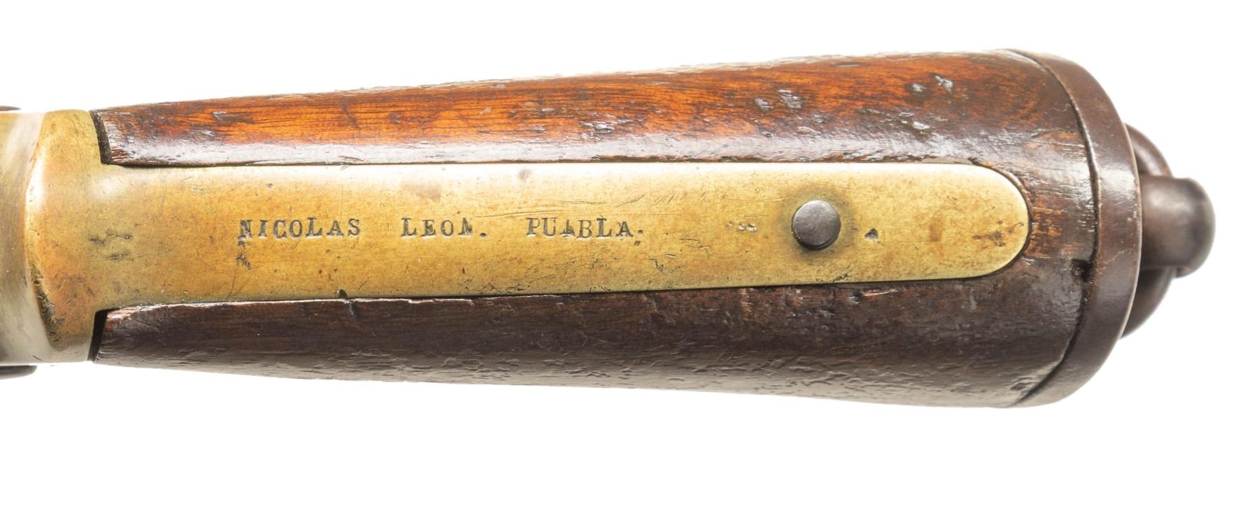 BLOCK PISTOL. Cal. 50CF. NSN. Copy of Remington's 1871, but with brass frame, marked "NICOLAS LEON, PUEBLA" on backstrap. CONDITION: very good, complete, "as found" patina iron & brass, inside top toes of grips are chipped. Mechanics fine, clean rifled bore. PROVENANCE: Estate Collection of Compton LaBauve Jr. (01-28928/JS). ANTIQUE. $600-900.