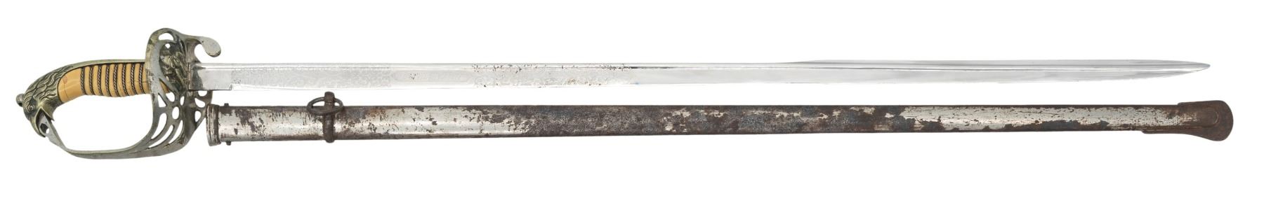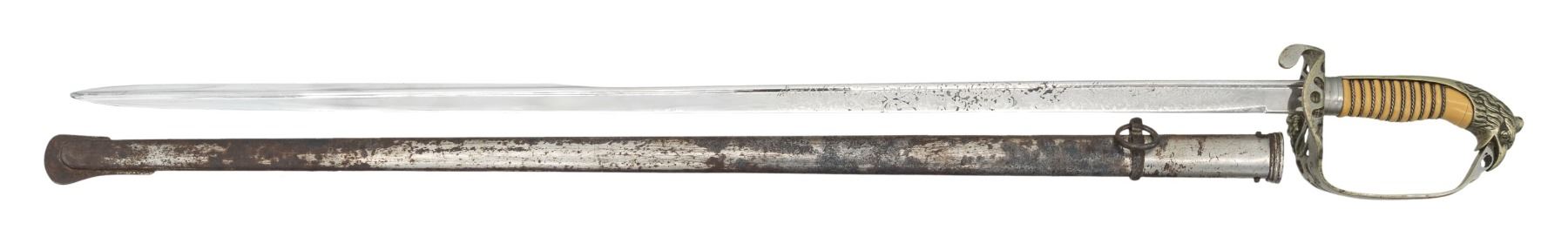 Attractive circa 1900-1910 Toledo made plated eagle head pommel sword with eagle, snake, & liberty cap Mexican Republic seal cast in guard, 31" quill back etched blade, celluloid & twisted wire grip, plated iron scabbard. CONDITION: good overall, blade is bright, celluloid grip veneer chipped. (02-25641/JS). NON-GUN. $300-500.
