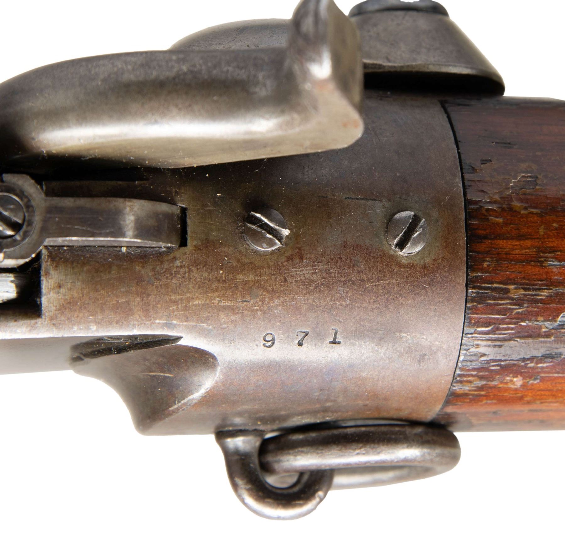 Cal. 50. S# 971. This is a scarce postwar manufacture using existing Civil War frames, and pivoting "Spencer Patent cut-off" in place of ejector on top of breechblock, which can disallow cartridges from loading tube just like Stabler devise on military contract guns. Serial numbered in its own range on the left side of the frame. 20" 3-land & groove barrel, "NM" stamped rear of adjustable rear sight. CONDITION: very good to fine, appears original, complete, & authentic, barrel retains about 80% thin blue finish, plum patina, breech components mismatched S# 837, no S# on barrel other than "1" stamped. Stocks sound with old varnish, scattered scratches, and small dings & dents. Drilled at the back of the frame for tang sight, breech has strong traces of case colors, Mechanics fine, including functional "Spencer patent cut-off". Shiny rifled bore. PROVENANCE: Estate Collection of John "Jack" Dhooghe. (01-28266/JS). ANTIQUE. $1,000-2,000.